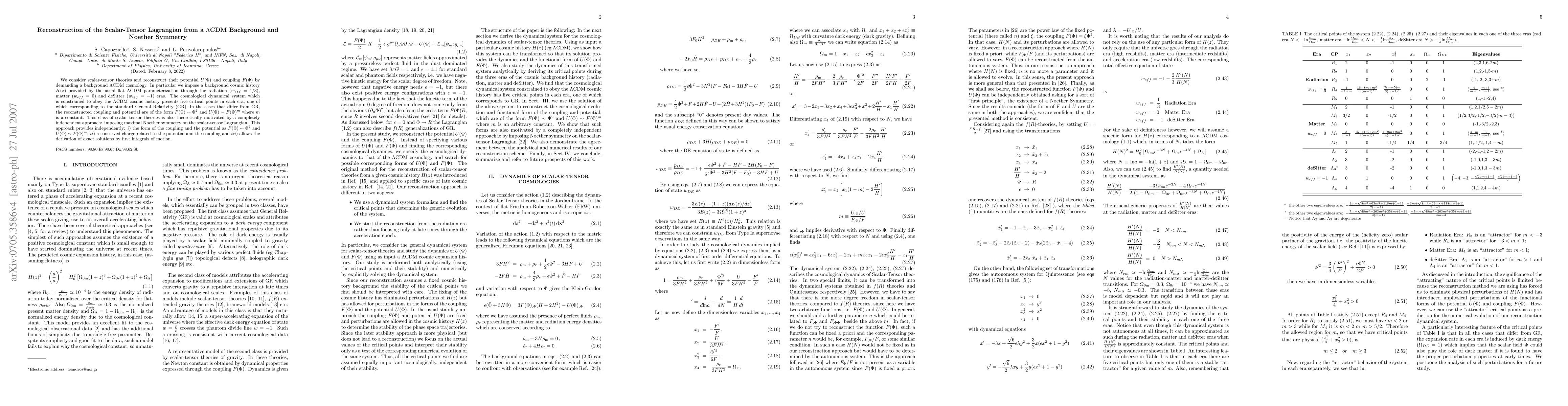 We consider scalar-tensor theories and reconstruct their potential U(\Phi) and coupling F(\Phi) by demanding a background LCDM cosmology. In particular we impose a background cosmic history H(z) provided by the usual flat LCDM parameterization through the radiation (w_{eff}=1/3), matter (w_{eff}=0) and deSitter (w_{eff}=-1) eras. The cosmological dynamical system which is constrained to obey the LCDM cosmic history presents five critical points in each era, one of which corresponding to the standard General Relativity (GR). In the cases that differ from GR, the reconstructed coupling and potential are of the form F(\Phi)\sim \Phi^2 and U(\Phi)\sim F(\Phi)^m where m is a constant. This class of scalar tensor theories is also theoretically motivated by a completely independent approach: imposing maximal Noether symmetry on the scalar-tensor Lagrangian. This approach provides independently: i) the form of the coupling and the potential as F(\Phi)\sim \Phi^2 and U(\Phi)\sim F(\Phi)^m, ii) a conserved charge related to the potential and the coupling and iii) allows the derivation of exact solutions by first integrals of motion.