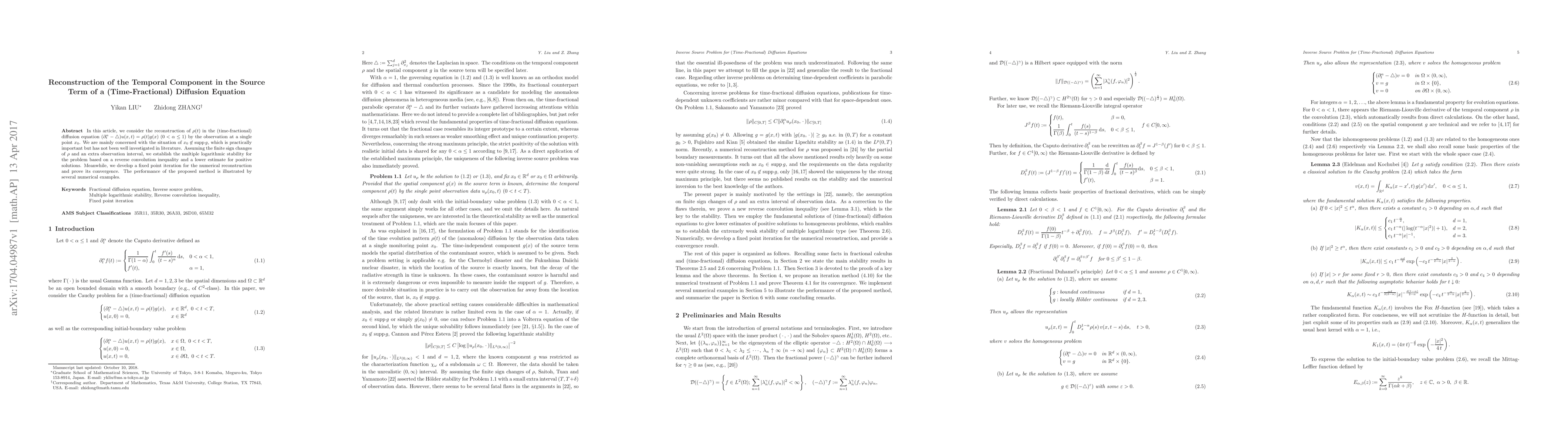 This paper reconstructs the temporal component $\rho(t)$ in a time-fractional diffusion equation using observations at a single point, especially when this point is outside the support of $g(x)$. It establishes multiple logarithmic stability and develops a convergent fixed point iteration for numerical reconstruction, validated by numerical examples.