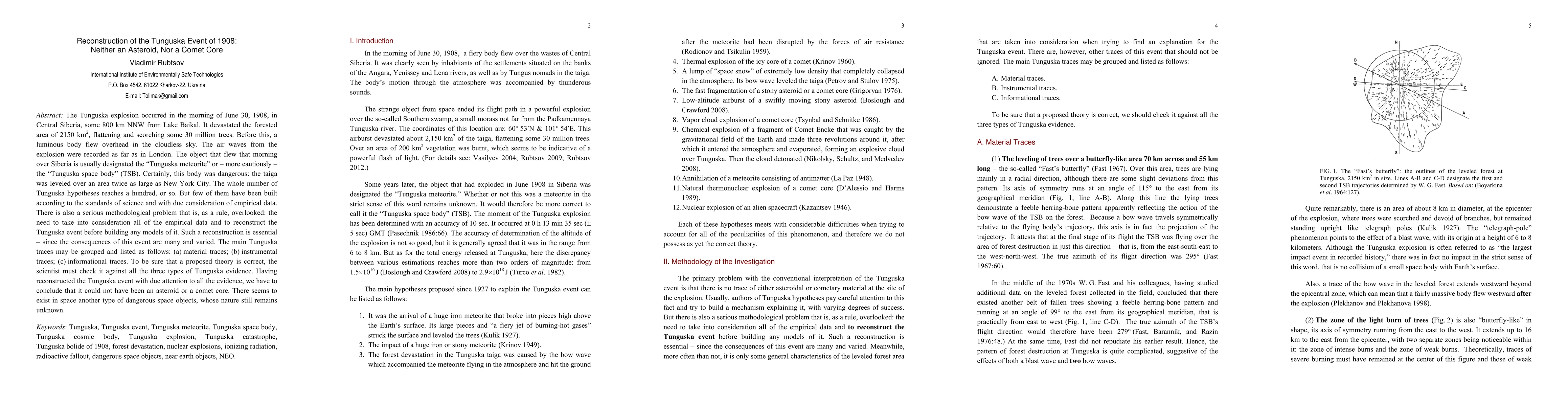 The Tunguska explosion occurred in the morning of June 30, 1908, in Central Siberia, some 800 km NNW from Lake Baikal. It devastated the forested area of 2150 sq. km, flattening and scorching some 30 million trees. Before this, a luminous body flew overhead in the cloudless sky. The air waves from the explosion were recorded as far as in London. The object that flew that morning over Siberia is usually designated the "Tunguska meteorite" or - more cautiously - the "Tunguska space body" (TSB). Certainly, this body was dangerous: the taiga was leveled over an area twice as large as New York City. The whole number of Tunguska hypotheses reaches a hundred, or so. But few of them have been built according to the standards of science and with due consideration of empirical data. There is also a serious methodological problem that is, as a rule, overlooked: the need to take into consideration all empirical data and to reconstruct the Tunguska event before building any models of it. Such a reconstruction is essential - since the consequences of this event are many and varied. The main Tunguska traces may be grouped and listed as follows: (a) material traces; (b) instrumental traces; (c) informational traces. To be sure that a proposed theory is correct, the scientist must check it against all the three types of Tunguska evidence. Having reconstructed the Tunguska event with due attention to all the evidence, we have to conclude that it could not have been an asteroid or a comet core. There seems to exist in space another type of dangerous space objects, whose nature still remains unknown.
