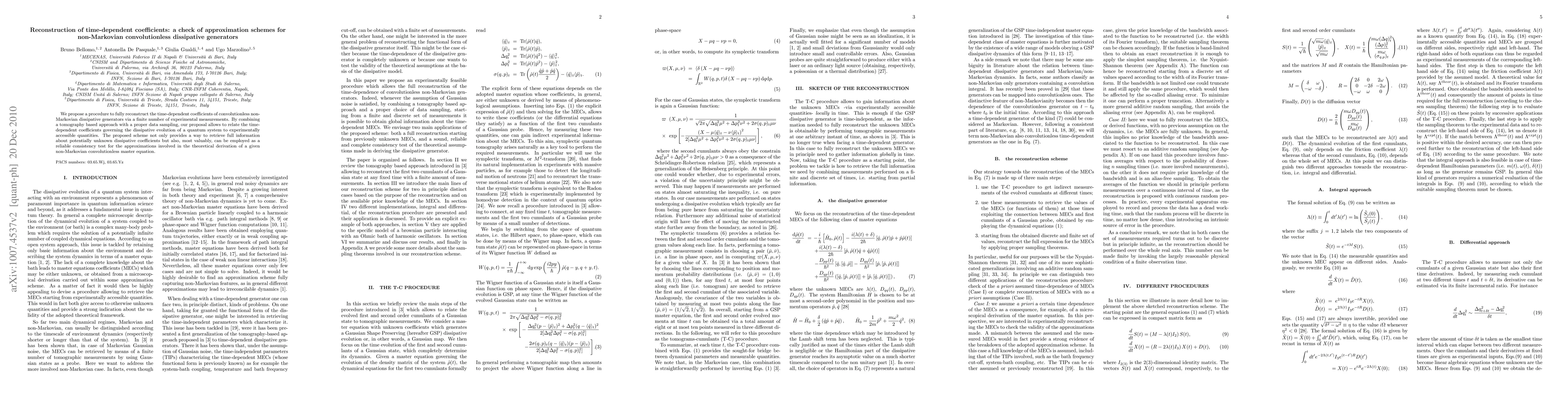 This paper proposes a method to reconstruct the time-dependent coefficients of non-Markovian convolutionless dissipative generators using a finite number of experimental measurements. The approach combines tomography and data sampling to relate these coefficients to measurable quantities, offering a reliable consistency test for theoretical approximations in non-Markovian dynamics.