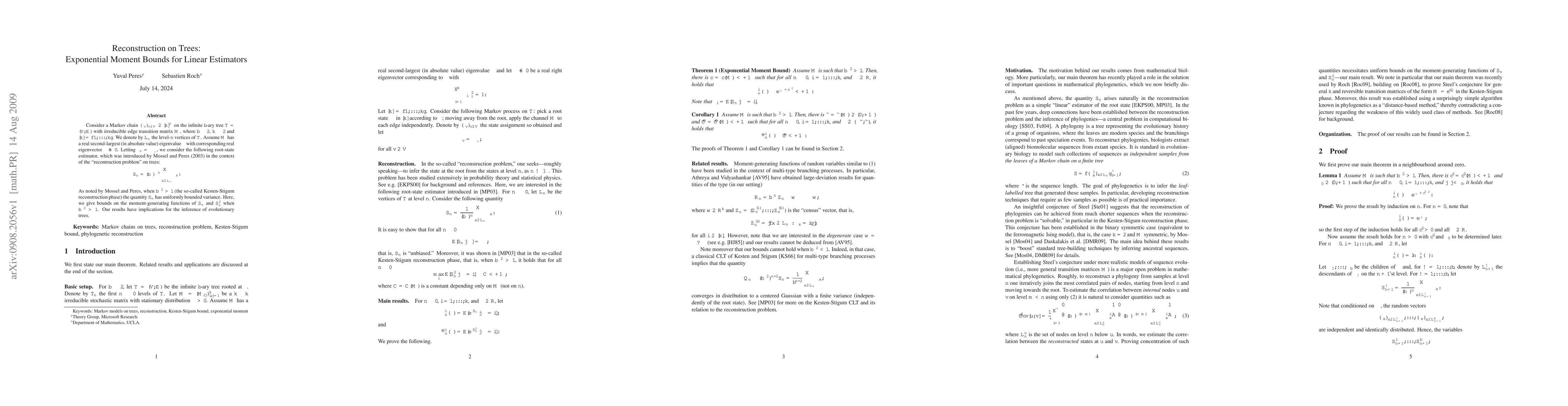 Consider a Markov chain $(\xi_v)_{v \in V} \in [k]^V$ on the infinite $b$-ary tree $T = (V,E)$ with irreducible edge transition matrix $M$, where $b \geq 2$, $k \geq 2$ and $[k] = \{1,...,k\}$. We denote by $L_n$ the level-$n$ vertices of $T$. Assume $M$ has a real second-largest (in absolute value) eigenvalue $\lambda$ with corresponding real eigenvector $\nu \neq 0$. Letting $\sigma_v = \nu_{\xi_v}$, we consider the following root-state estimator, which was introduced by Mossel and Peres (2003) in the context of the "recontruction problem" on trees: \begin{equation*} S_n = (b\lambda)^{-n} \sum_{x\in L_n} \sigma_x. \end{equation*} As noted by Mossel and Peres, when $b\lambda^2 > 1$ (the so-called Kesten-Stigum reconstruction phase) the quantity $S_n$ has uniformly bounded variance. Here, we give bounds on the moment-generating functions of $S_n$ and $S_n^2$ when $b\lambda^2 > 1$. Our results have implications for the inference of evolutionary trees.
