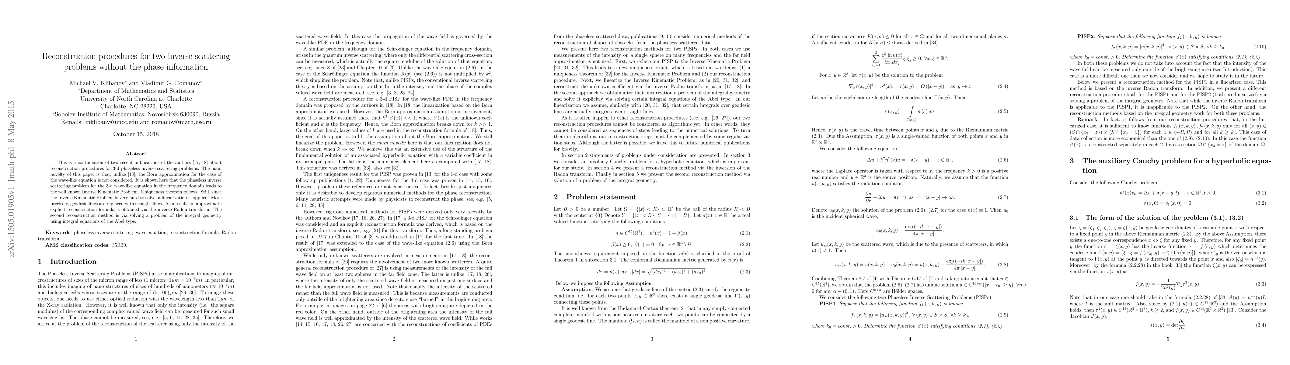 This is a continuation of two recent publications of the authors about reconstruction procedures for 3-d phaseless inverse scattering problems. The main novelty of this paper is that the Born approximation for the case of the wave-like equation is not considered. It is shown here that the phaseless inverse scattering problem for the 3-d wave-like equation in the frequency domain leads to the well known Inverse Kinematic Problem. Uniqueness theorem follows. Still, since the Inverse Kinematic Problem is very hard to solve, a linearization is applied. More precisely, geodesic lines are replaced with straight lines. As a result, an approximate explicit reconstruction formula is obtained via the inverse Radon transform. The second reconstruction method is via solving a problem of the integral geometry using integral equations of the Abel type.