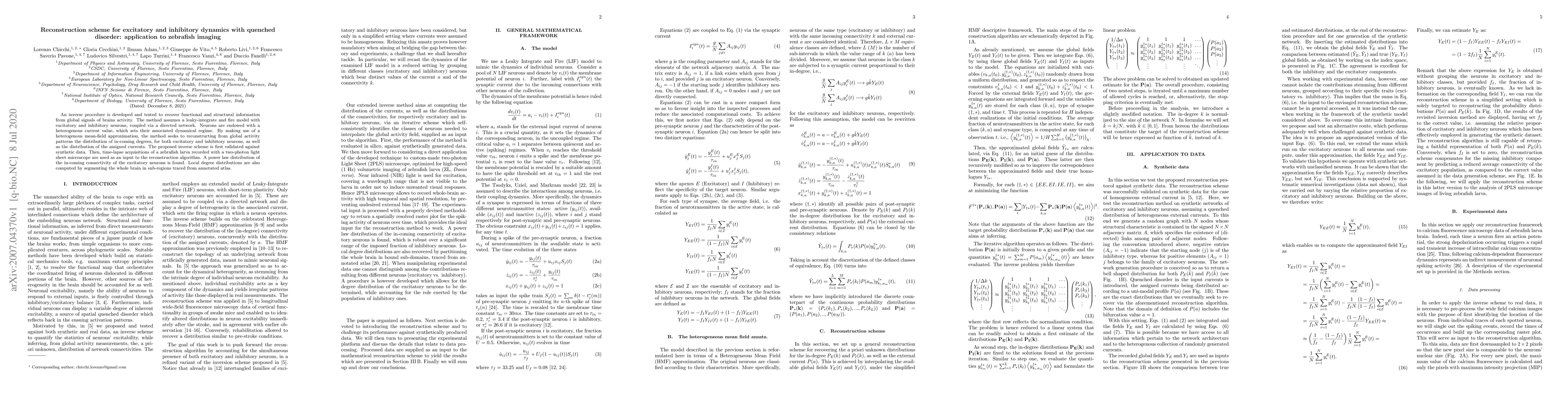 An inverse procedure is developed and tested to recover functional and structural information from global signals of brains activity. The method assumes a leaky-integrate and fire model with excitatory and inhibitory neurons, coupled via a directed network. Neurons are endowed with a heterogenous current value, which sets their associated dynamical regime. By making use of a heterogenous mean-field approximation, the method seeks to reconstructing from global activity patterns the distribution of in-coming degrees, for both excitatory and inhibitory neurons, as well as the distribution of the assigned currents. The proposed inverse scheme is first validated against synthetic data. Then, time-lapse acquisitions of a zebrafish larva recorded with a two-photon light sheet microscope are used as an input to the reconstruction algorithm. A power law distribution of the in-coming connectivity of the excitatory neurons is found. Local degree distributions are also computed by segmenting the whole brain in sub-regions traced from annotated atlas.