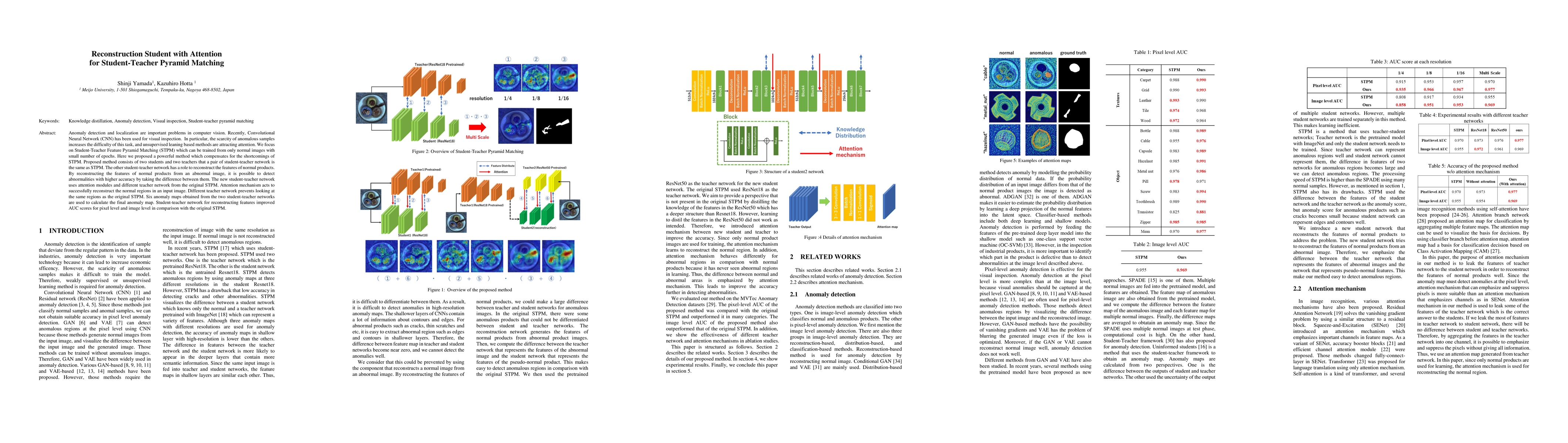 This paper proposes an enhanced Student-Teacher Feature Pyramid Matching (STPM) method for anomaly detection in computer vision, utilizing two student-teacher networks with attention modules to reconstruct normal features and improve detection accuracy. The new approach outperforms the original STPM in both pixel-level and image-level AUC scores.