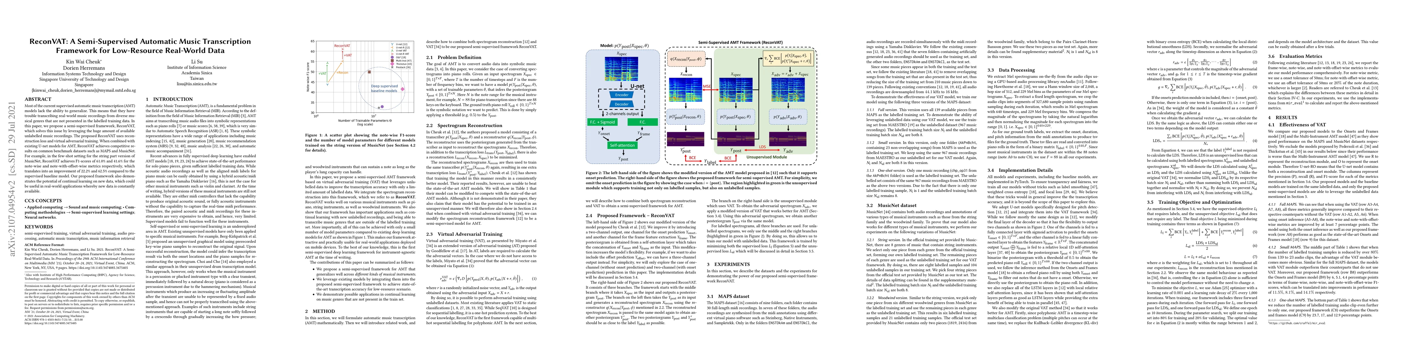 ReconVAT is a semi-supervised framework for automatic music transcription that leverages unlabelled data to improve transcription of diverse musical genres. It combines reconstruction loss and virtual adversarial training with U-net models, achieving significant improvements in few-shot learning settings and demonstrating potential for continual learning.