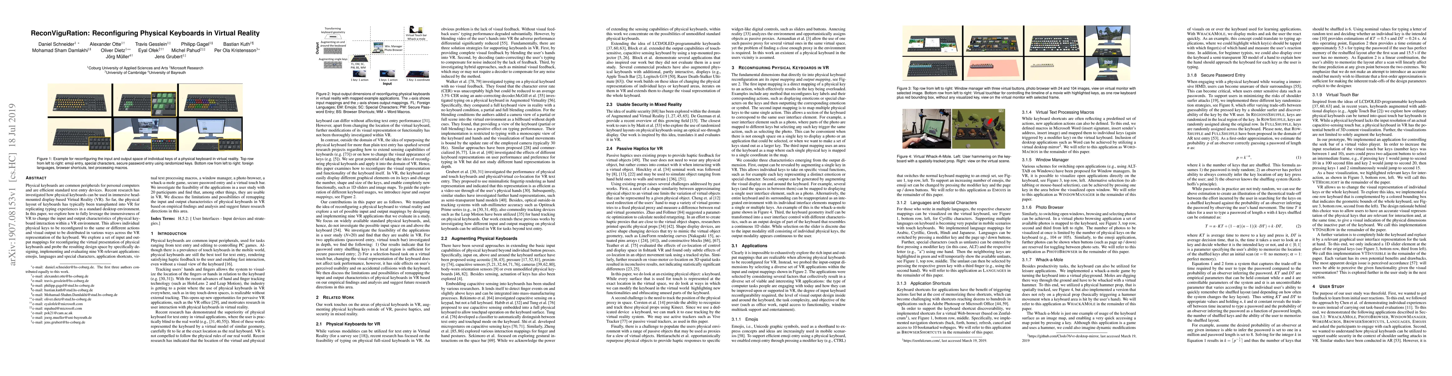 This paper investigates innovative ways to reconfigure physical keyboards for use in VR, exploring various input and output mappings to enhance the typing experience. Through a user study, it demonstrates the usability of nine VR applications, highlighting the potential and limitations of adapting physical keyboards in immersive environments.