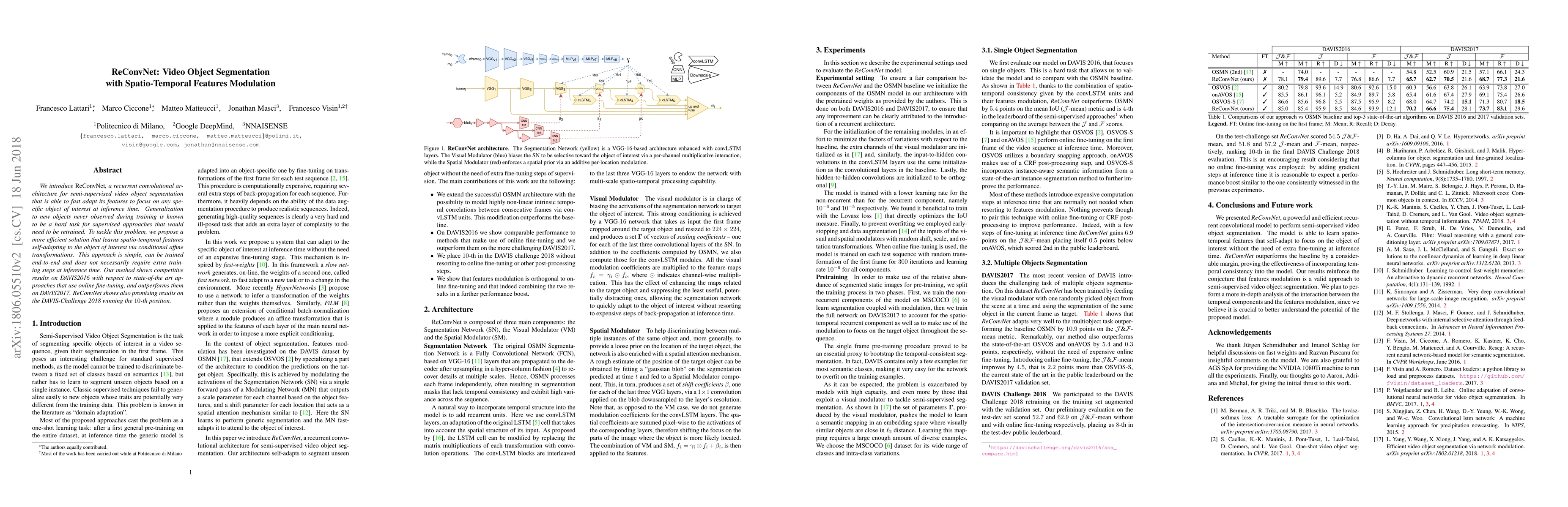 We introduce ReConvNet, a recurrent convolutional architecture for semi-supervised video object segmentation that is able to fast adapt its features to focus on any specific object of interest at inference time. Generalization to new objects never observed during training is known to be a hard task for supervised approaches that would need to be retrained. To tackle this problem, we propose a more efficient solution that learns spatio-temporal features self-adapting to the object of interest via conditional affine transformations. This approach is simple, can be trained end-to-end and does not necessarily require extra training steps at inference time. Our method shows competitive results on DAVIS2016 with respect to state-of-the art approaches that use online fine-tuning, and outperforms them on DAVIS2017. ReConvNet shows also promising results on the DAVIS-Challenge 2018 winning the $10$-th position.