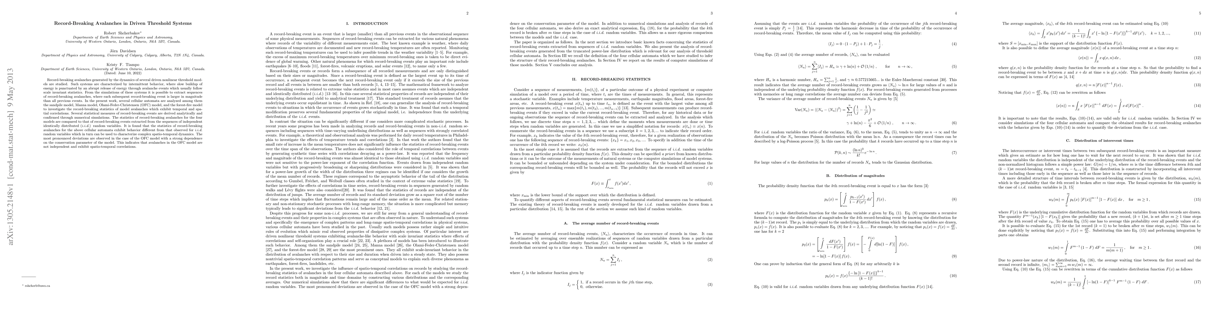 This paper studies record-breaking avalanches in several driven nonlinear threshold models, including cellular automata like the sandpile and OFC models. Analytical and numerical analyses reveal distinct statistical behaviors of these avalanches compared to independent random variables, with significant deviations in the OFC model due to its spatio-temporal correlations.