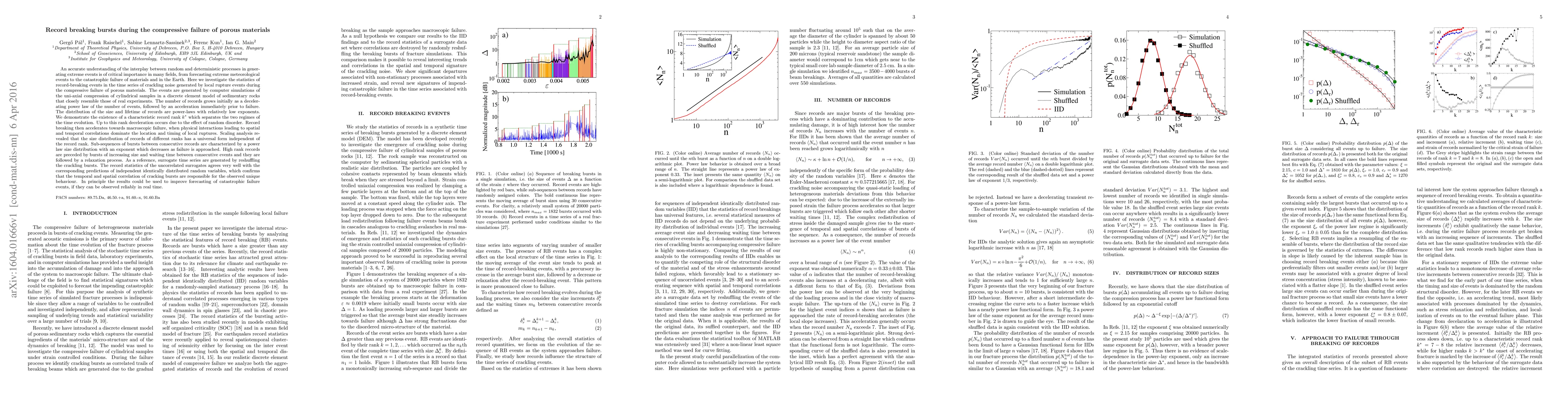 This paper investigates the statistical properties of record-breaking events during the compressive failure of porous materials, revealing that the number of records follows a decelerating power law initially, then accelerates before macroscopic failure. The study highlights the role of random disorder and physical interactions in determining the timing and size of rupture events, and confirms that temporal and spatial correlations are key to the observed behavior.