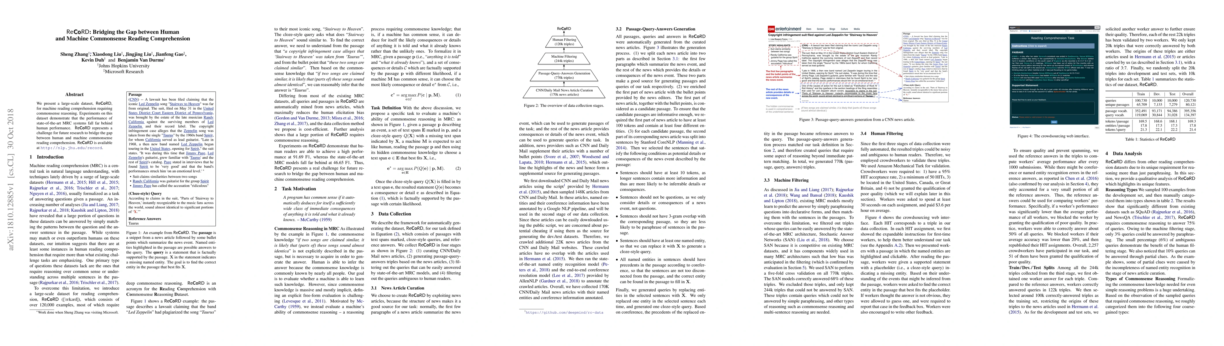 Summary: ReCoRD is a new dataset designed to enhance machine reading comprehension through commonsense reasoning, revealing significant gaps between current AI performance and human capabilities. It aims to spur future research to close this gap.