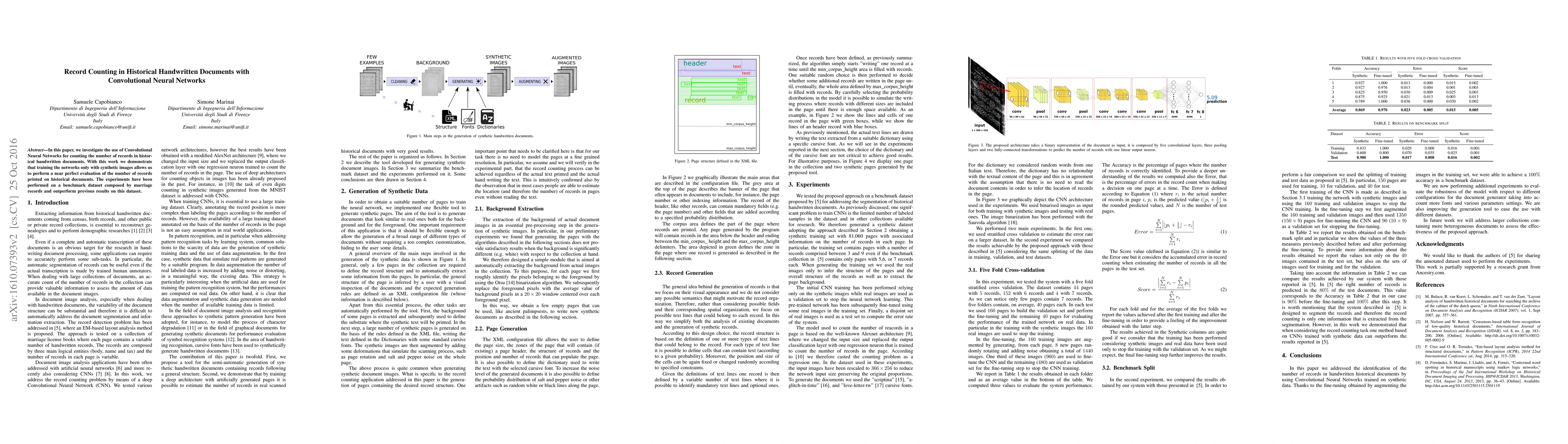 Summary: This paper explores the application of Convolutional Neural Networks for counting records in historical handwritten documents, demonstrating near-perfect accuracy using synthetic images, and achieving superior results on a benchmark dataset of marriage records compared to prior methods.