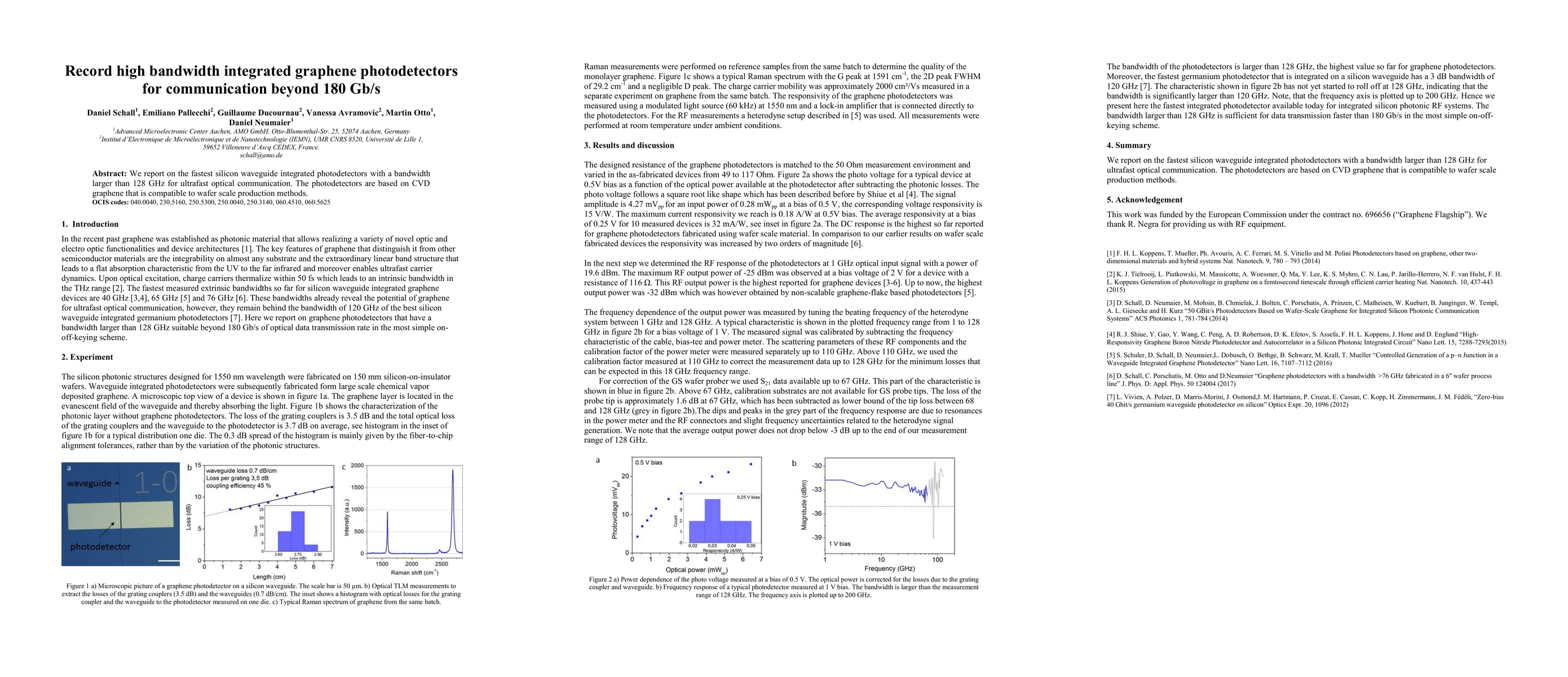 Summary: This paper presents silicon waveguide integrated photodetectors based on CVD graphene achieving a record bandwidth over 128 GHz, enabling ultrafast optical communication beyond 180 Gb/s, with potential for wafer-scale fabrication.