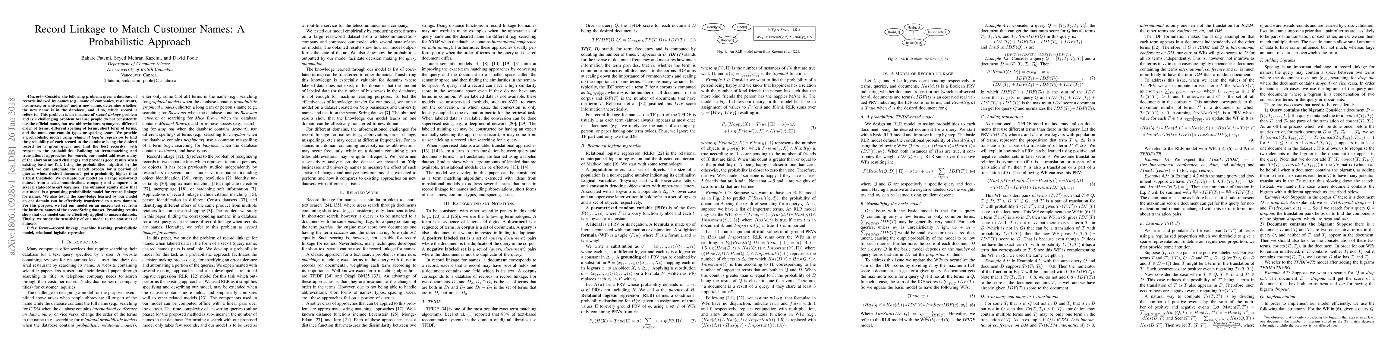 This paper proposes a probabilistic model using relational logistic regression for record linkage to match customer names, addressing inconsistencies like abbreviations, typos, and spelling variations. The model outperforms baselines and shows potential for domain transfer and sensitivity to dataset statistics.