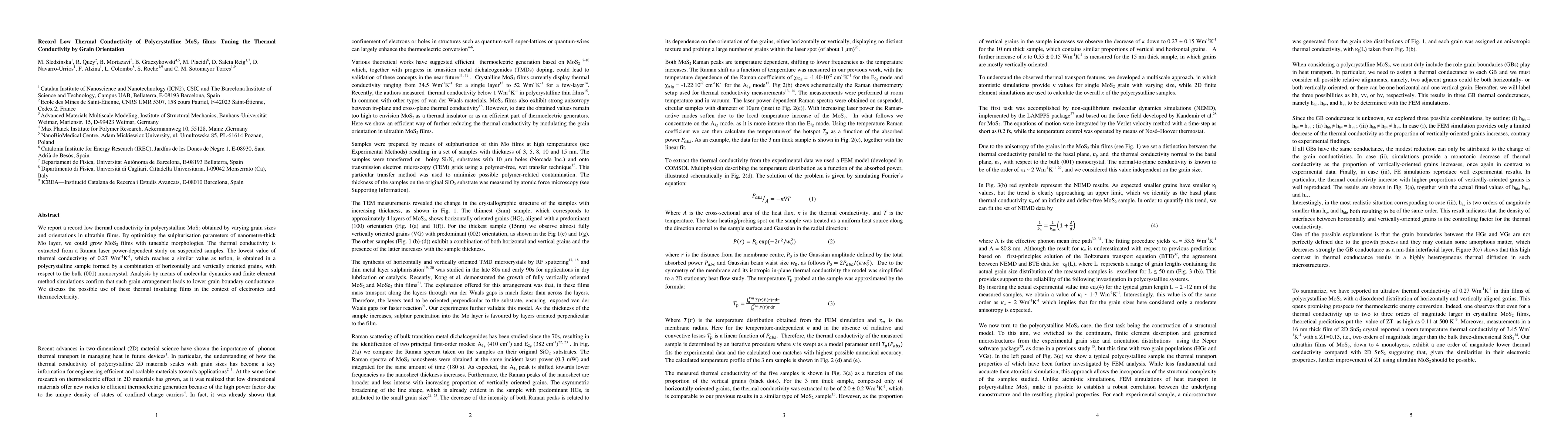 This paper reports record low thermal conductivity in polycrystalline MoS2 films achieved by controlling grain sizes and orientations, reaching 0.27 Wm-1K-1. Simulations confirm that a combination of horizontally and vertically oriented grains minimizes grain boundary conductance, suggesting potential applications in electronics and thermoelectricity.