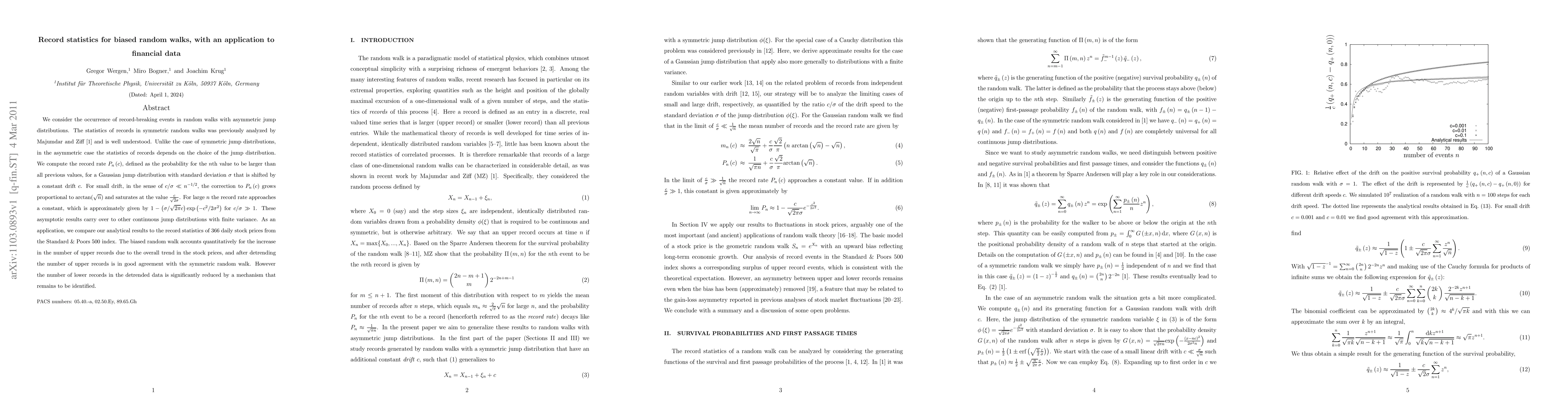 We consider the occurrence of record-breaking events in random walks with asymmetric jump distributions. The statistics of records in symmetric random walks was previously analyzed by Majumdar and Ziff and is well understood. Unlike the case of symmetric jump distributions, in the asymmetric case the statistics of records depends on the choice of the jump distribution. We compute the record rate $P_n(c)$, defined as the probability for the $n$th value to be larger than all previous values, for a Gaussian jump distribution with standard deviation $\sigma$ that is shifted by a constant drift $c$. For small drift, in the sense of $c/\sigma \ll n^{-1/2}$, the correction to $P_n(c)$ grows proportional to arctan$(\sqrt{n})$ and saturates at the value $\frac{c}{\sqrt{2} \sigma}$. For large $n$ the record rate approaches a constant, which is approximately given by $1-(\sigma/\sqrt{2\pi}c)\textrm{exp}(-c^2/2\sigma^2)$ for $c/\sigma \gg 1$. These asymptotic results carry over to other continuous jump distributions with finite variance. As an application, we compare our analytical results to the record statistics of 366 daily stock prices from the Standard & Poors 500 index. The biased random walk accounts quantitatively for the increase in the number of upper records due to the overall trend in the stock prices, and after detrending the number of upper records is in good agreement with the symmetric random walk. However the number of lower records in the detrended data is significantly reduced by a mechanism that remains to be identified.
