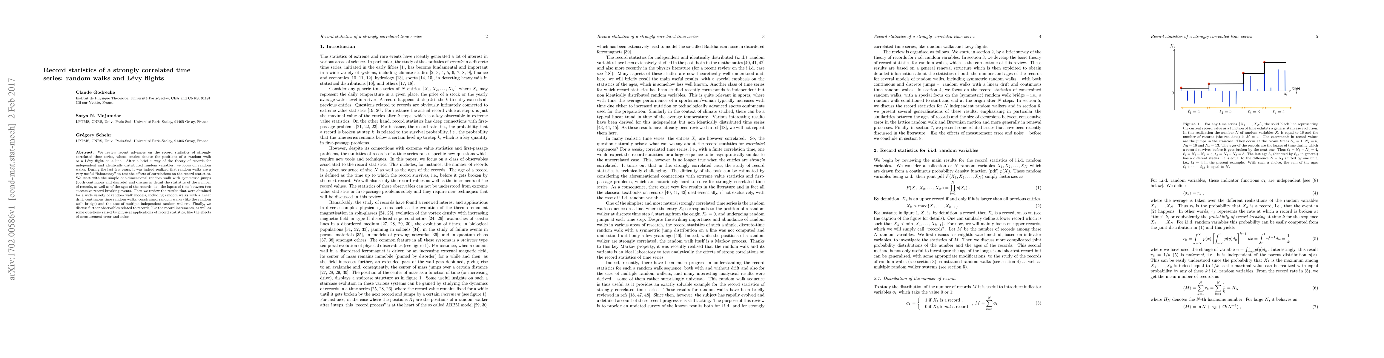 This paper reviews advances in record statistics for strongly correlated time series, emphasizing random walks and Lévy flights. It discusses the statistics of records, record ages, and various random walk models, concluding with considerations of measurement error and noise in physical applications.