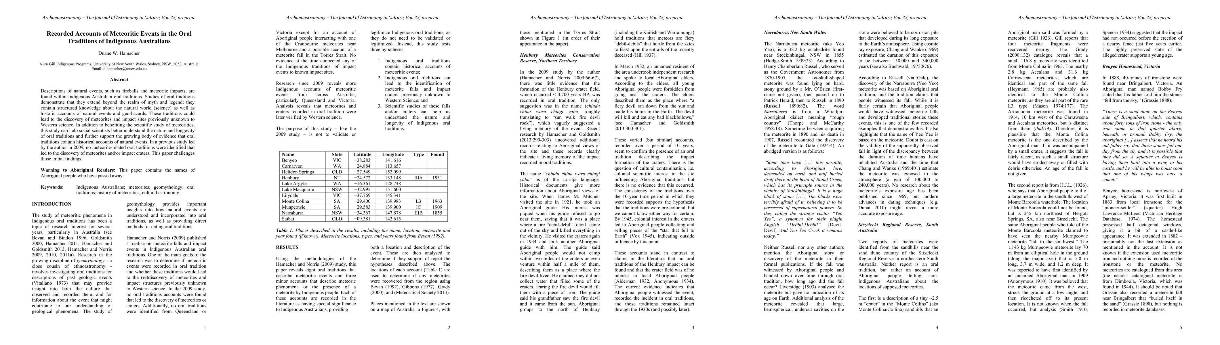 This paper explores how Indigenous Australian oral traditions contain detailed accounts of meteoritic events, suggesting these traditions hold structured knowledge about natural phenomena and historical geo-hazards. It aims to identify new meteorites and impact sites, contributing to both the scientific study of meteoritics and the understanding of the longevity and historical accuracy of oral traditions.