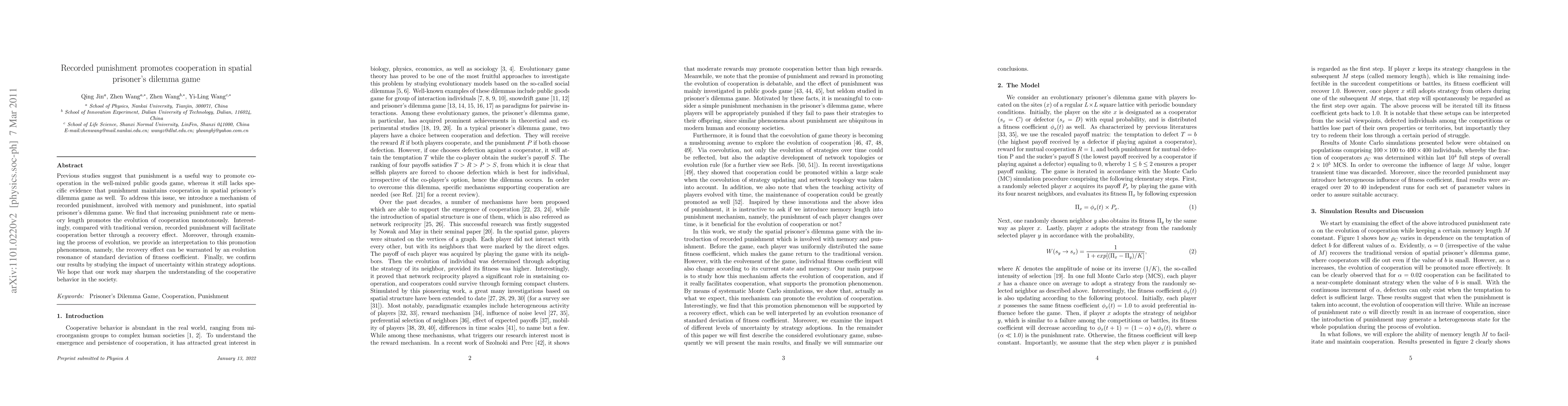 Previous studies suggest that punishment is a useful way to promote cooperation in the well-mixed public goods game, whereas it still lacks specific evidence that punishment maintains cooperation in spatial prisoner's dilemma game as well. To address this issue, we introduce a mechanism of recorded punishment, involved with memory and punishment, into spatial prisoner's dilemma game. We find that increasing punishment rate or memory length promotes the evolution of cooperation monotonously. Interestingly, compared with traditional version, recorded punishment will facilitate cooperation better through a recovery effect. Moreover, through examining the process of evolution, we provide an interpretation to this promotion phenomenon, namely, the recovery effect can be warranted by an evolution resonance of standard deviation of fitness coefficient. Finally, we confirm our results by studying the impact of uncertainty within strategy adoptions. We hope that our work may sharpen the understanding of the cooperative behavior in the society.