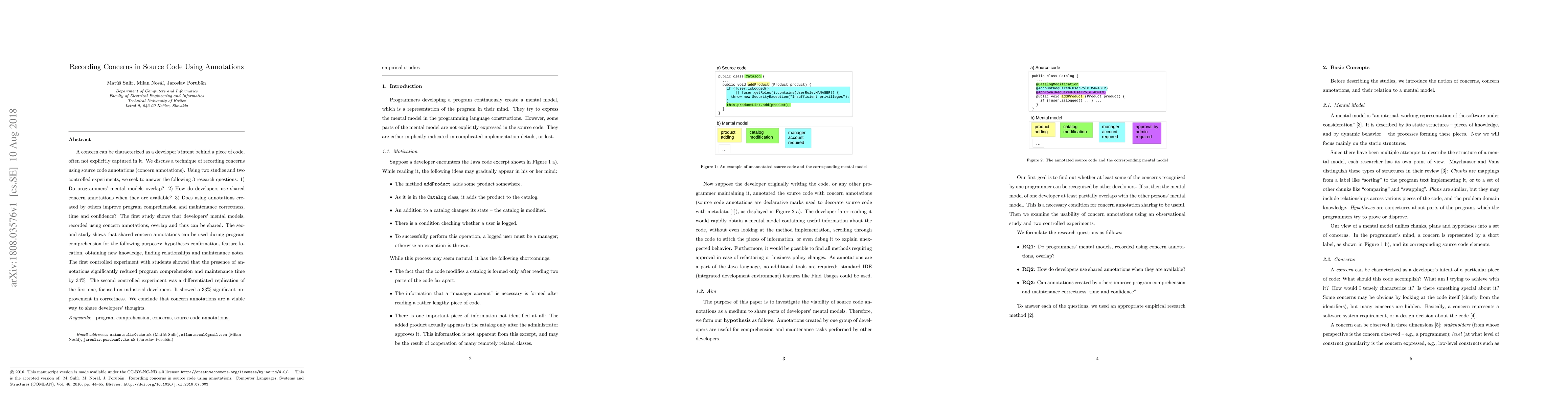 A concern can be characterized as a developer's intent behind a piece of code, often not explicitly captured in it. We discuss a technique of recording concerns using source code annotations (concern annotations). Using two studies and two controlled experiments, we seek to answer the following 3 research questions: 1) Do programmers' mental models overlap? 2) How do developers use shared concern annotations when they are available? 3) Does using annotations created by others improve program comprehension and maintenance correctness, time and confidence? The first study shows that developers' mental models, recorded using concern annotations, overlap and thus can be shared. The second study shows that shared concern annotations can be used during program comprehension for the following purposes: hypotheses confirmation, feature location, obtaining new knowledge, finding relationships and maintenance notes. The first controlled experiment with students showed that the presence of annotations significantly reduced program comprehension and maintenance time by 34%. The second controlled experiment was a differentiated replication of the first one, focused on industrial developers. It showed a 33% significant improvement in correctness. We conclude that concern annotations are a viable way to share developers' thoughts.