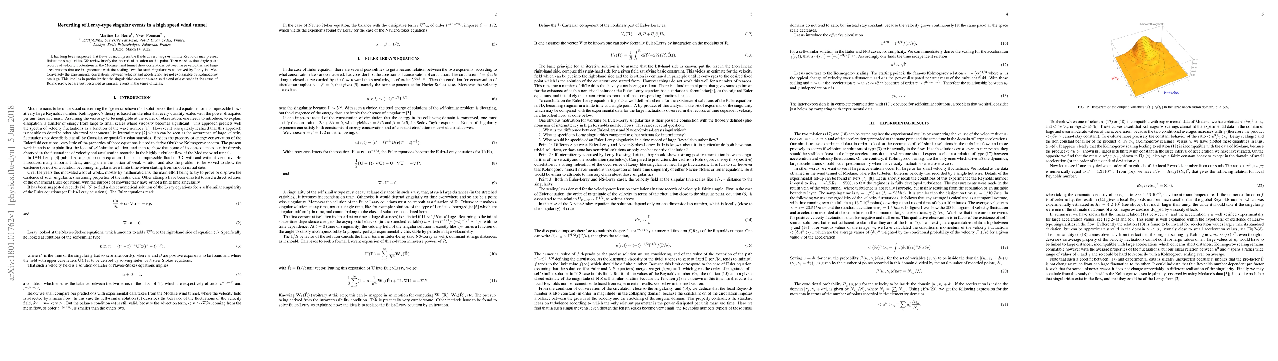 It has long been suspected that flows of incompressible fluids at very large or infinite Reynolds may present finite time singularities. We review briefly the theoretical situation on this point. Then we show that single point records of velocity fluctuations in the Modane wind tunnel show correlations between large velocities and large accelerations that are in agreement with the scaling laws for such singularities as derived by Leray in 1934. Conversely the experimental correlations between velocity and acceleration are not explainable by Kolmogorov scalings. This implies in particular that the singularities cannot be seen as the end of a cascade in the sense of Kolmogorov, but are best described as singular events in the sense of Leray.