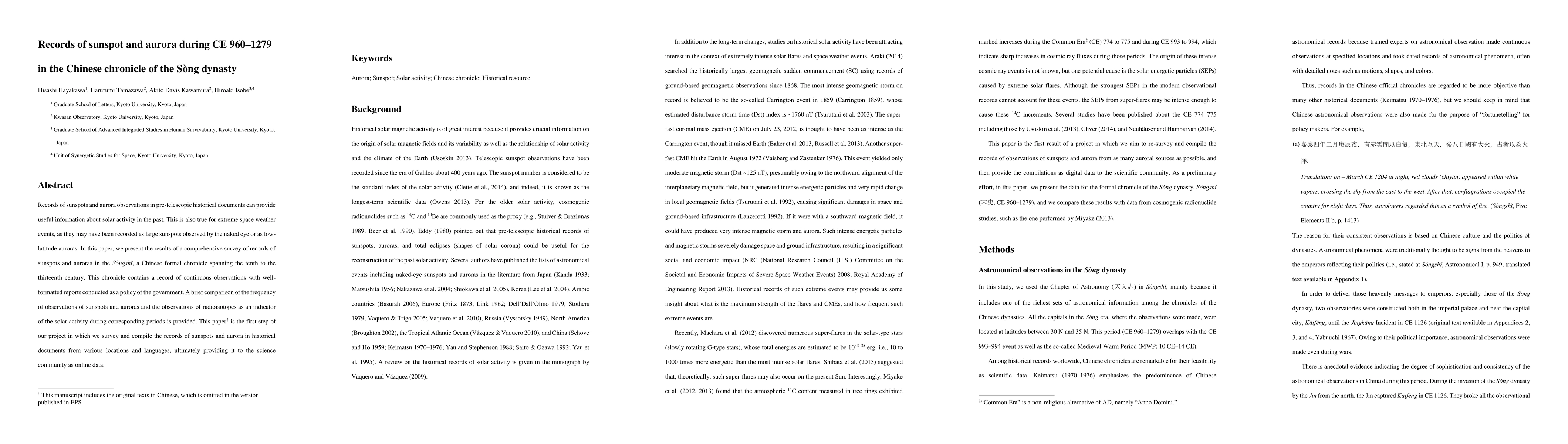 Records of sunspots and aurora observations in pre-telescopic historical documents can provide useful information about solar activity in the past. This is also true for extreme space weather events, as they may have been recorded as large sunspots observed by the naked eye or as low-latitude auroras. In this paper, we present the results of a comprehensive survey of records of sunspots and auroras in the Songshi, a Chinese formal chronicle spanning the tenth to the thirteenth century. This chronicle contains a record of continuous observations with well-formatted reports conducted as a policy of the government. A brief comparison of the frequency of observations of sunspots and auroras and the observations of radioisotopes as an indicator of the solar activity during corresponding periods is provided. This paper is the first step of our project in which we survey and compile the records of sunspots and aurora in historical documents from various locations and languages, ultimately providing it to the science community as online data.