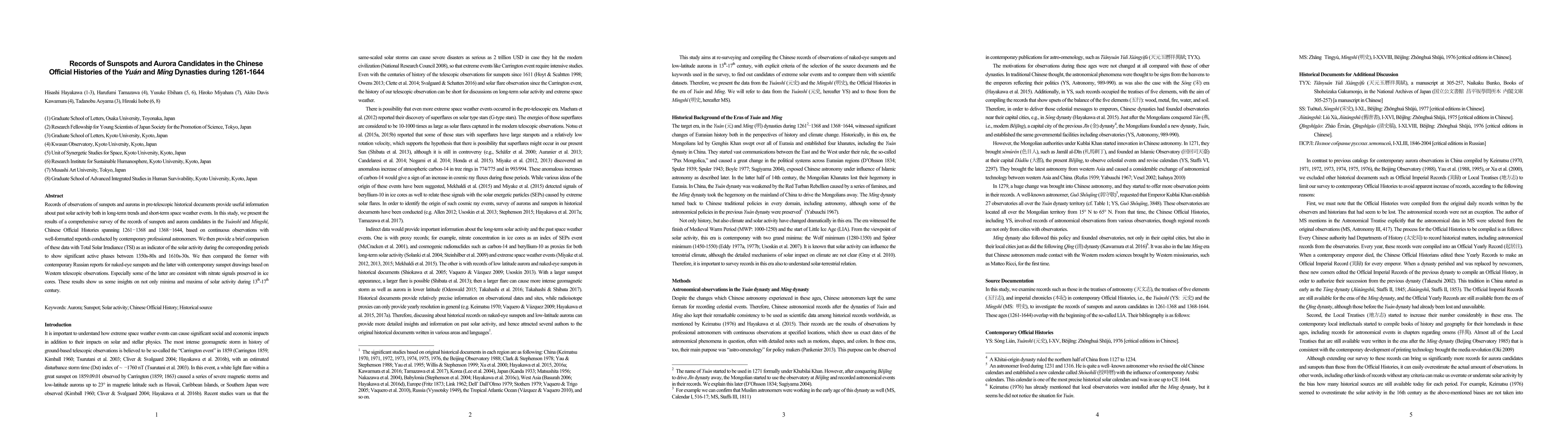 Historical records of sunspots and auroras from Chinese official histories reveal significant active phases in solar activity between 1350s-80s and 1610s-30s, providing insights into past solar cycles.
