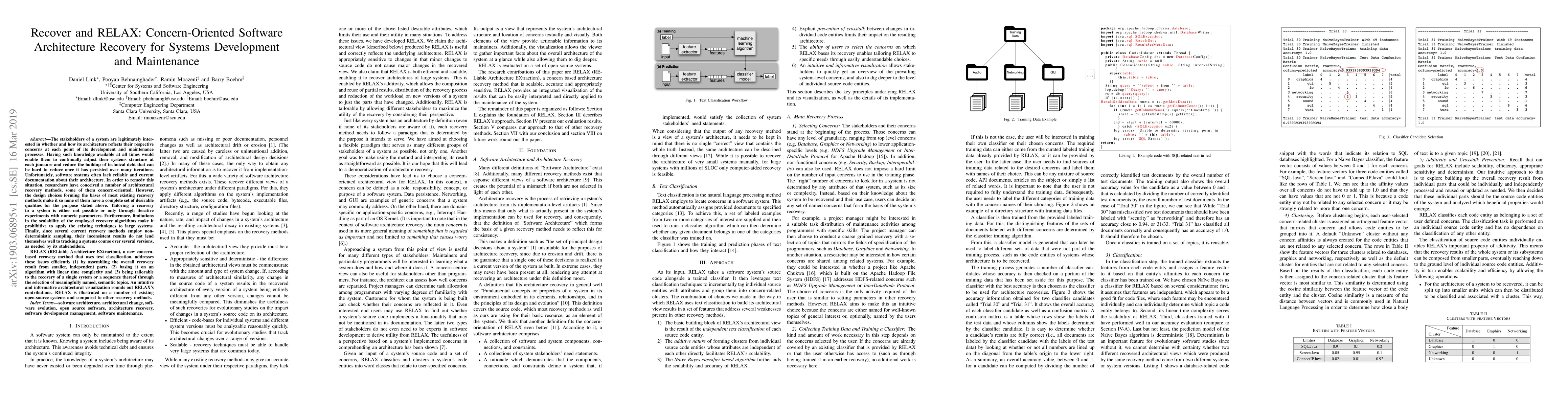 The stakeholders of a system are legitimately interested in whether and how its architecture reflects their respective concerns at each point of its development and maintenance processes. Having such knowledge available at all times would enable them to continually adjust their systems structure at each juncture and reduce the buildup of technical debt that can be hard to reduce once it has persisted over many iterations. Unfortunately, software systems often lack reliable and current documentation about their architecture. In order to remedy this situation, researchers have conceived a number of architectural recovery methods, some of them concern-oriented. However, the design choices forming the bases of most existing recovery methods make it so none of them have a complete set of desirable qualities for the purpose stated above. Tailoring a recovery to a system is either not possible or only through iterative experiments with numeric parameters. Furthermore, limitations in their scalability make it prohibitive to apply the existing techniques to large systems. Finally, since several current recovery methods employ non-deterministic sampling, their inconsistent results do not lend themselves well to tracking a systems course over several versions, as needed by its stakeholders. RELAX (RELiable Architecture EXtraction), a new concern-based recovery method that uses text classification, addresses these issues efficiently by (1) assembling the overall recovery result from smaller, independent parts, (2) basing it on an algorithm with linear time complexity and (3) being tailorable to the recovery of a single system or a sequence thereof through the selection of meaningfully named, semantic topics. An intuitive, informative architectural visualization rounds out RELAX's contributions. RELAX is illustrated on a number of existing open-source systems and compared to other recovery methods.