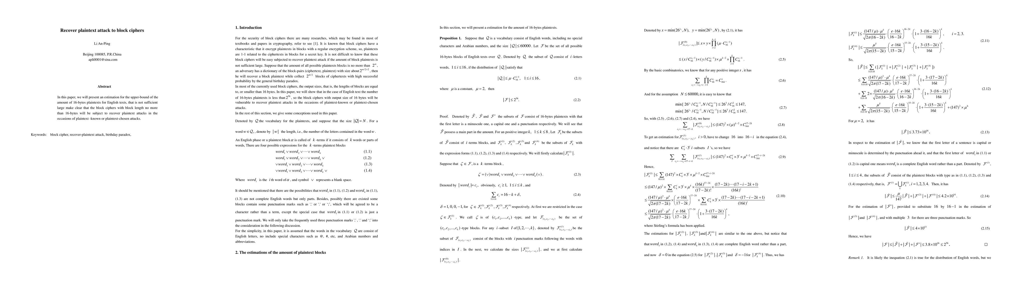 Summary: This paper estimates the upper limit of 16-byte plaintexts for English texts, demonstrating that block ciphers with a block size of 16 bytes or less are vulnerable to recover plaintext attacks under known or chosen plaintext scenarios.