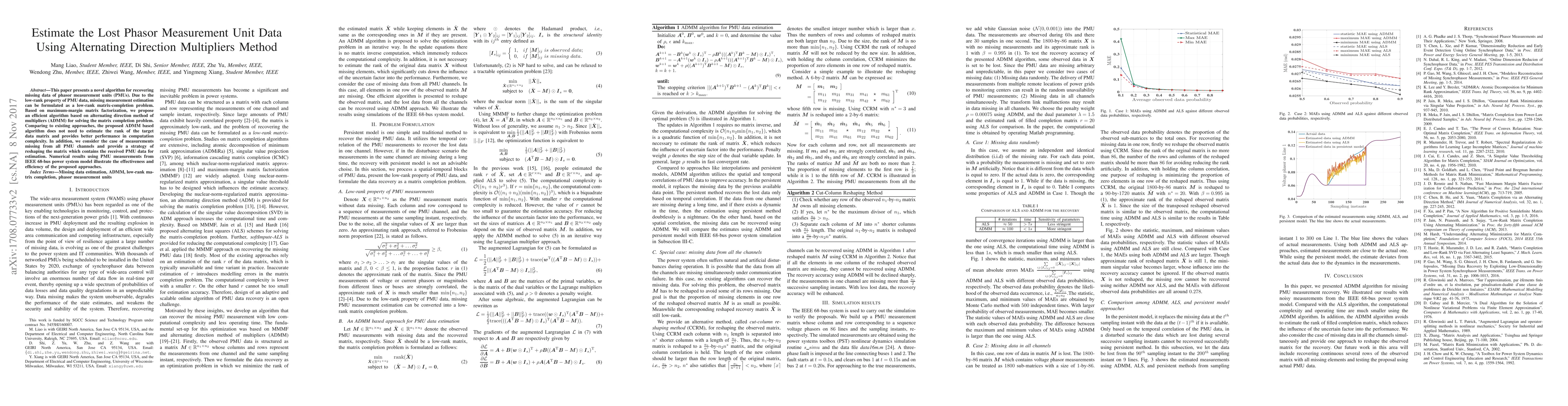This paper presents a novel algorithm for recovering missing data of phasor measurement units (PMUs). Due to the low-rank property of PMU data, missing measurement recovery can be formulated as a low-rank matrix-completion problem. Based on maximum-margin matrix factorization, we propose an efficient algorithm based on alternating direction method of multipliers (ADMM) for solving the matrix completion problem. Comparing to existing approaches, the proposed ADMM based algorithm does not need to estimate the rank of the target data matrix and provides better performance in computation complexity. In addition, we consider the case of measurements missing from all PMU channels and provide a strategy of reshaping the matrix which contains the received PMU data for recovery. Numerical results using PMU measurements from IEEE 68-bus power system model illustrate the effectiveness and efficiency of the proposed approaches.