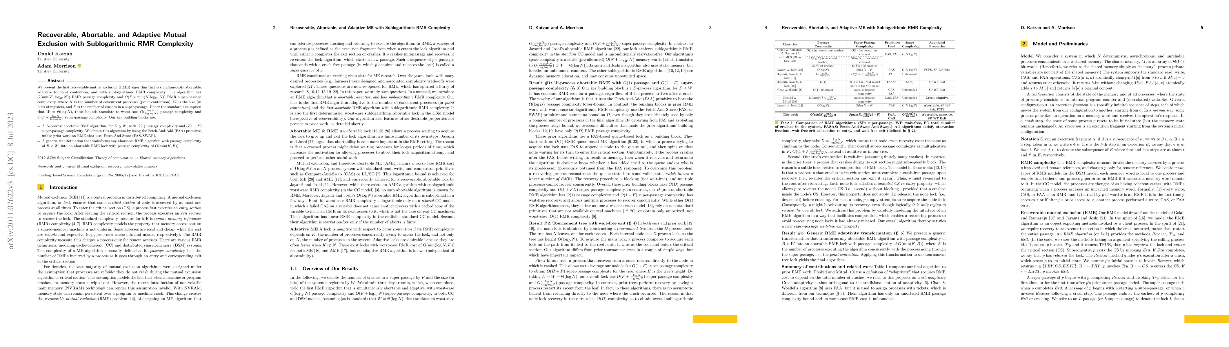 This paper introduces a novel recoverable mutual exclusion algorithm that is abortable, adaptive to point contention, and achieves sublogarithmic RMR complexity. The algorithm features $O(\min(K,\log_W N))$ passage complexity and $O(F + \min(K,\log_W N))$ super-passage complexity, leveraging the Fetch-And-Add primitive for improved efficiency.
