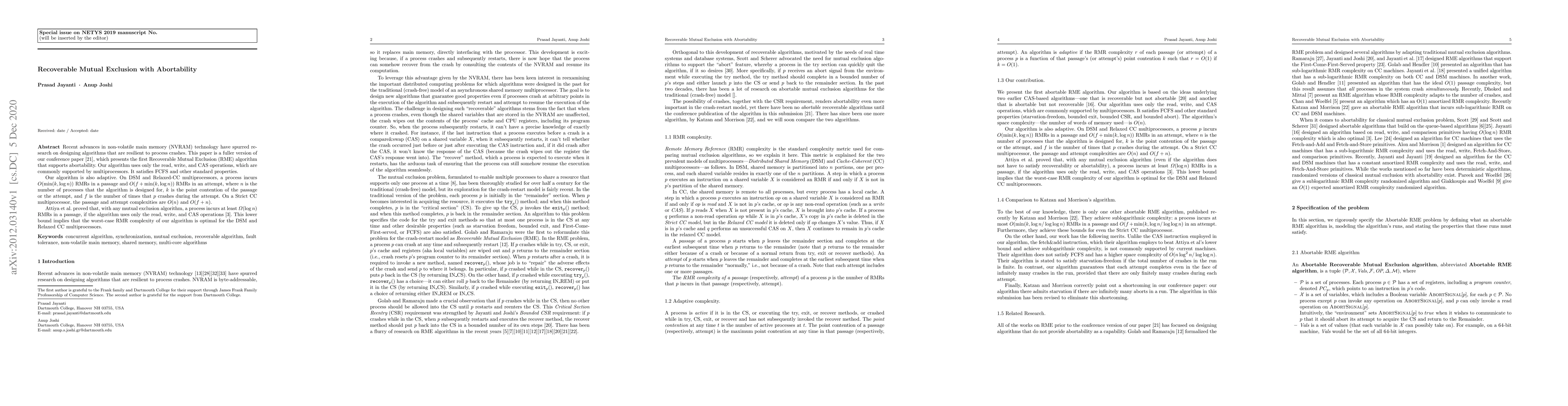 Recent advances in non-volatile main memory (NVRAM) technology have spurred research on designing algorithms that are resilient to process crashes. This paper is a fuller version of our conference paper \cite{jayanti:rmeabort}, which presents the first Recoverable Mutual Exclusion (RME) algorithm that supports abortability. Our algorithm uses only the read, write, and CAS operations, which are commonly supported by multiprocessors. It satisfies FCFS and other standard properties. Our algorithm is also adaptive. On DSM and Relaxed-CC multiprocessors, a process incurs $O(\min(k, \log n))$ RMRs in a passage and $O(f+ \min(k, \log n))$ RMRs in an attempt, where $n$ is the number of processes that the algorithm is designed for, $k$ is the point contention of the passage or the attempt, and $f$ is the number of times that $p$ crashes during the attempt. On a Strict CC multiprocessor, the passage and attempt complexities are $O(n)$ and $O(f+n)$. Attiya et al. proved that, with any mutual exclusion algorithm, a process incurs at least $\Omega(\log n)$ RMRs in a passage, if the algorithm uses only the read, write, and CAS operations \cite{Attiya:lbound}. This lower bound implies that the worst-case RMR complexity of our algorithm is optimal for the DSM and Relaxed CC multiprocessors.