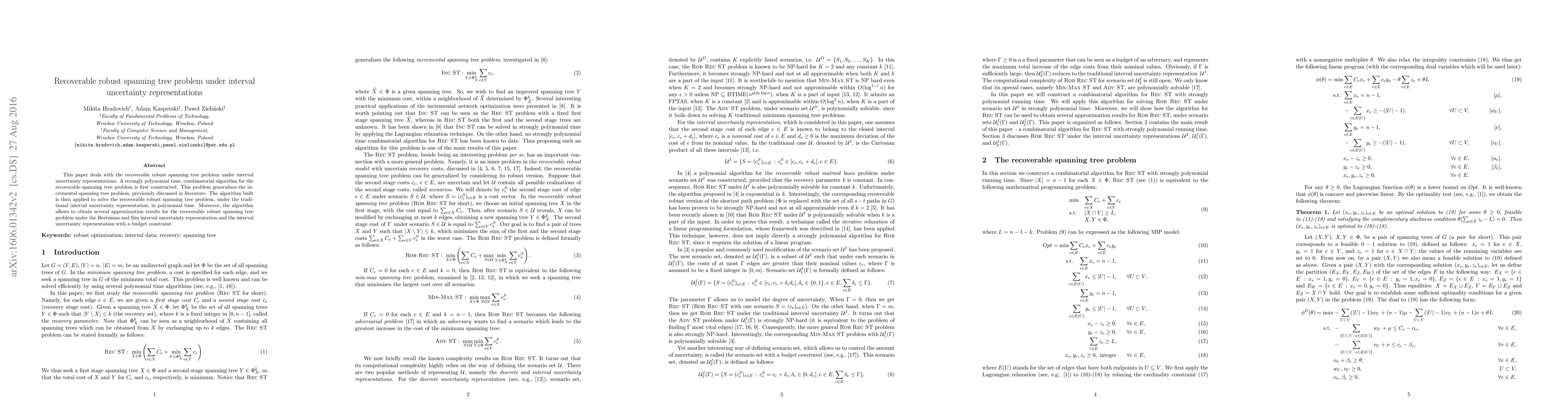 This paper deals with the recoverable robust spanning tree problem under interval uncertainty representations. A polynomial time, combinatorial algorithm for the recoverable spanning tree problem is first constructed. This problem generalizes the incremental spanning tree problem, previously discussed in literature. The algorithm built is then applied to solve the recoverable robust spanning tree problem, under the traditional interval uncertainty representation, in polynomial time. Moreover, the algorithm allows to obtain, under some mild assumptions about the uncertainty intervals,several approximation results for the recoverable robust spanning tree problem under the Bertsimas and Sim interval uncertainty representation and the interval uncertainty representation with a budget constraint.