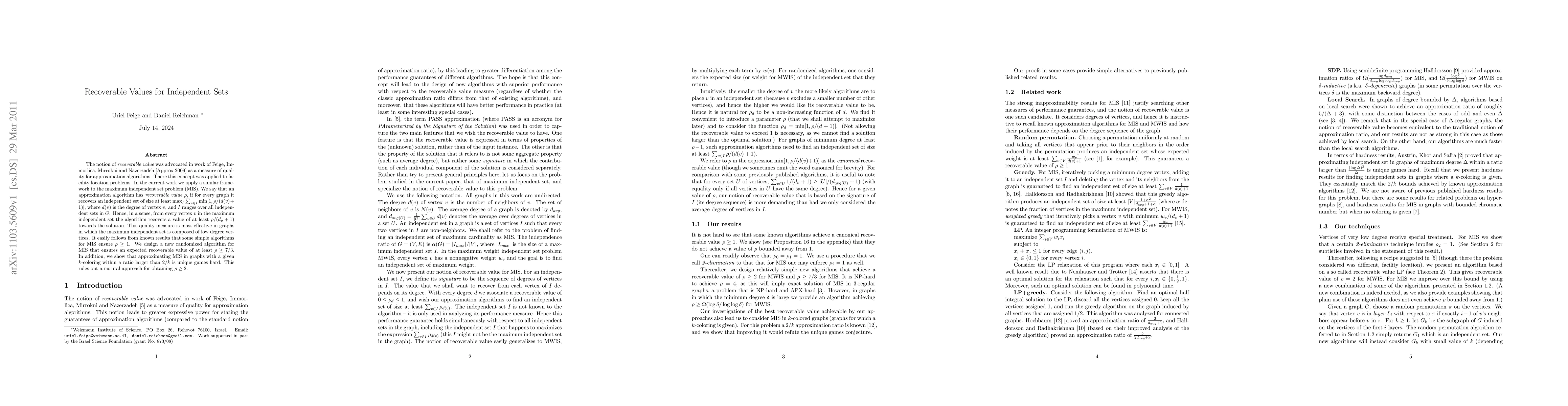 The notion of {\em recoverable value} was advocated in work of Feige, Immorlica, Mirrokni and Nazerzadeh [Approx 2009] as a measure of quality for approximation algorithms. There this concept was applied to facility location problems. In the current work we apply a similar framework to the maximum independent set problem (MIS). We say that an approximation algorithm has {\em recoverable value} $\rho$, if for every graph it recovers an independent set of size at least $\max_I \sum_{v\in I} \min[1,\rho/(d(v) + 1)]$, where $d(v)$ is the degree of vertex $v$, and $I$ ranges over all independent sets in $G$. Hence, in a sense, from every vertex $v$ in the maximum independent set the algorithm recovers a value of at least $\rho/(d_v + 1)$ towards the solution. This quality measure is most effective in graphs in which the maximum independent set is composed of low degree vertices. It easily follows from known results that some simple algorithms for MIS ensure $\rho \ge 1$. We design a new randomized algorithm for MIS that ensures an expected recoverable value of at least $\rho \ge 7/3$. In addition, we show that approximating MIS in graphs with a given $k$-coloring within a ratio larger than $2/k$ is unique games hard. This rules out a natural approach for obtaining $\rho \ge 2$.