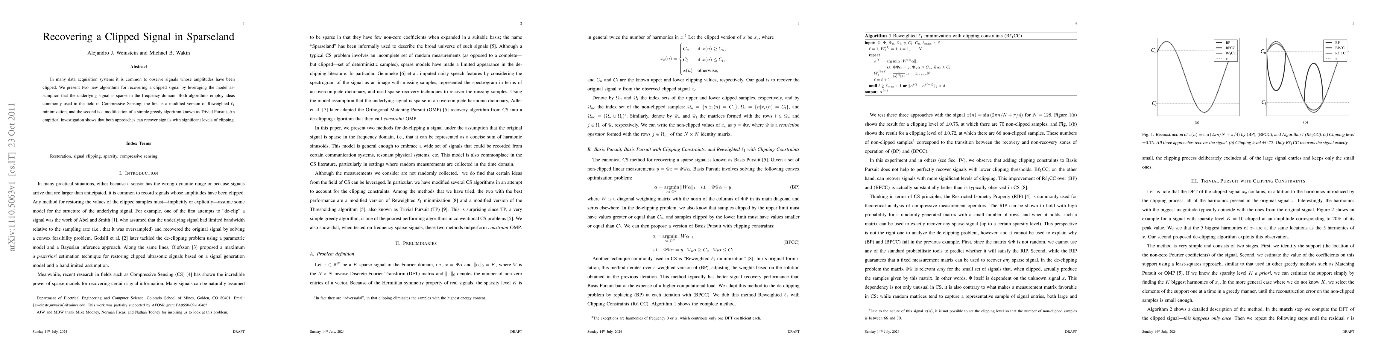 In many data acquisition systems it is common to observe signals whose amplitudes have been clipped. We present two new algorithms for recovering a clipped signal by leveraging the model assumption that the underlying signal is sparse in the frequency domain. Both algorithms employ ideas commonly used in the field of Compressive Sensing; the first is a modified version of Reweighted $\ell_1$ minimization, and the second is a modification of a simple greedy algorithm known as Trivial Pursuit. An empirical investigation shows that both approaches can recover signals with significant levels of clipping