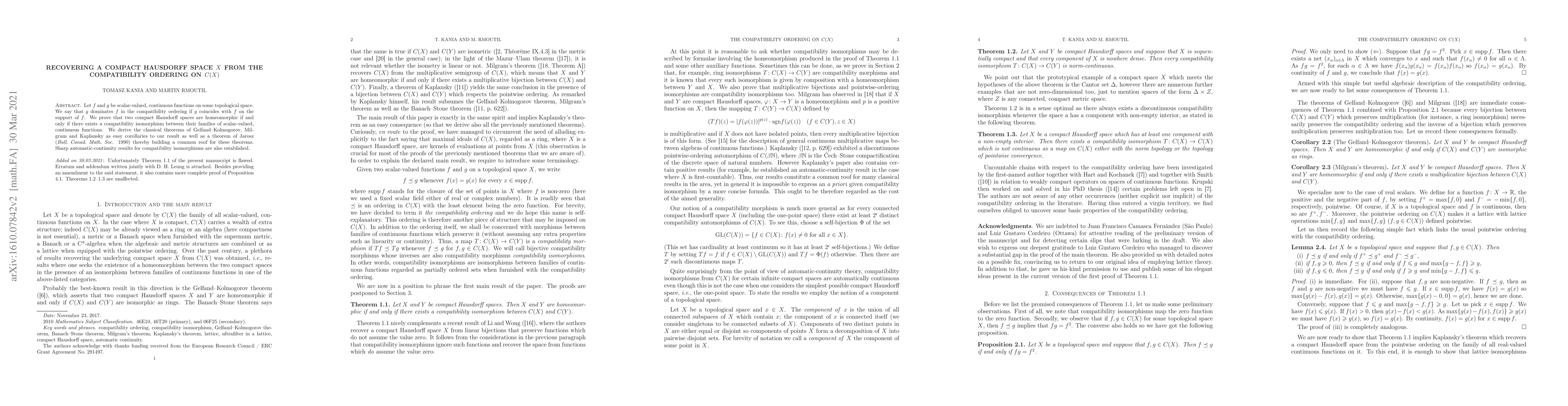 Let $f$ and $g$ be scalar-valued, continuous functions on some topological space. We say that $g$ dominates $f$ in the compatibility ordering if $g$ coincides with $f$ on the support of $f$. We prove that two compact Hausdorff spaces are homeomorphic if and only if there exists a compatibility isomorphism between their families of scalar-valued, continuous functions. We derive the classical theorems of Gelfand-Kolmogorov, Milgram and Kaplansky as easy corollaries to our result as well as a theorem of Jarosz [Bull. Canad. Math. Soc. 1990] thereby building~a common roof for these theorems. Sharp automatic-continuity results for compatibility isomorphisms are also established. Added on 30.03.2021: Unfortunately, Theorem 1.1 of the present manuscript is flawed. Erratum and addendum written jointly with D. H. Leung is attached. Besides providing an amendment to the said statement, it also contains more complete proof of Proposition 4.1. Theorems 1.2--1.3 are unaffected.