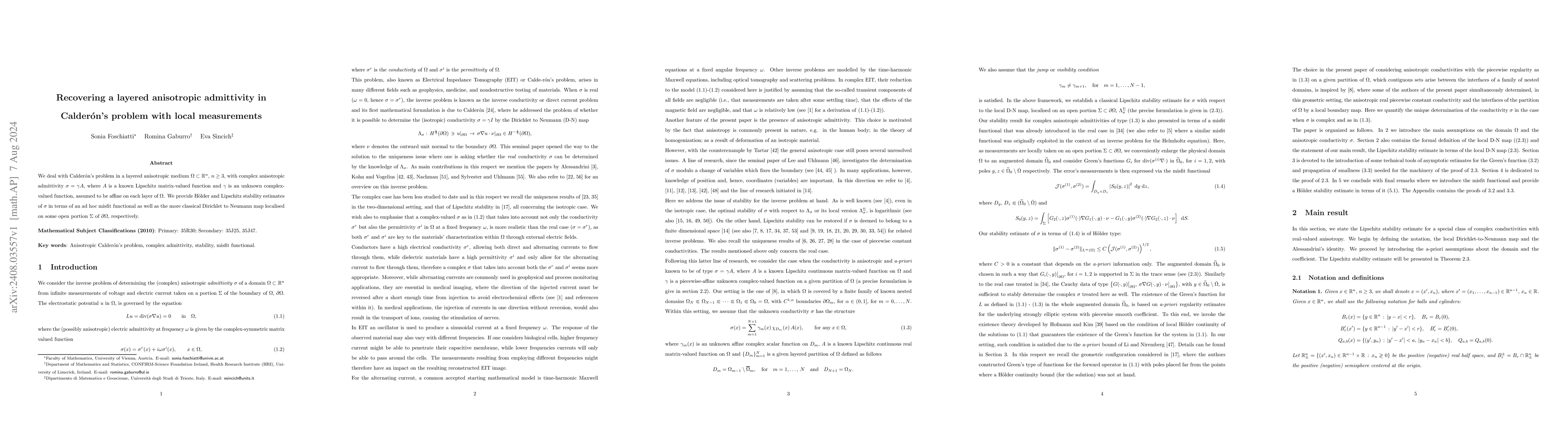 This paper addresses Calder\'on's problem in anisotropic media, providing Hölder and Lipschitz stability estimates for recovering complex anisotropic admittivity in a layered medium using local measurements, alongside a misfit functional and localized Dirichlet-to-Neumann maps.
