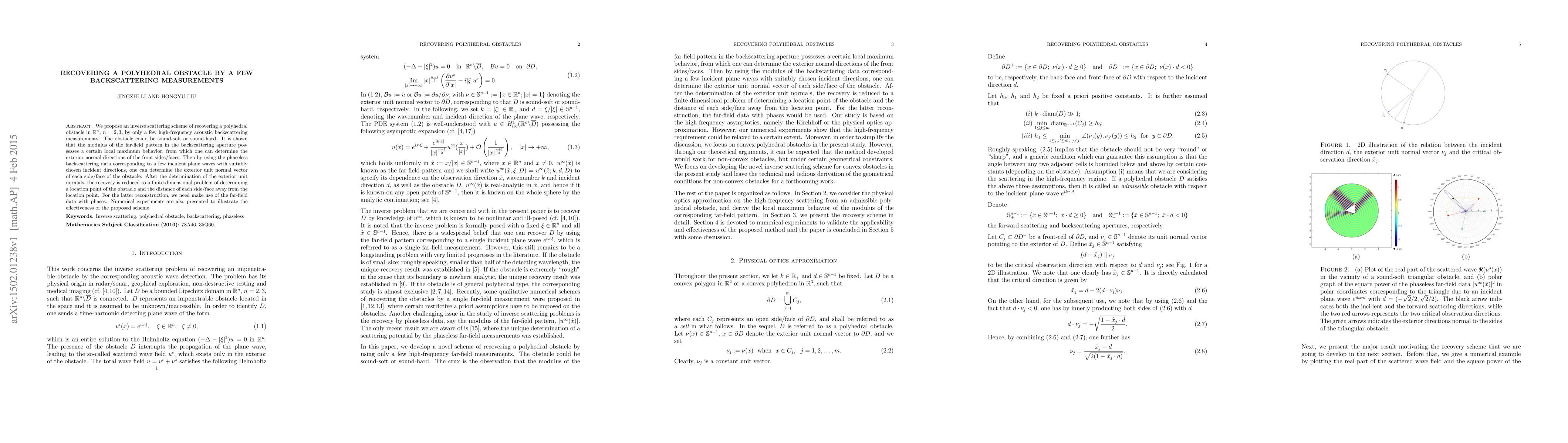Researchers propose a new method to recover the shape of a polyhedral obstacle using just a few high-frequency backscattering measurements. They can determine the exterior normal directions and unit normals of each face from these measurements, allowing for the reconstruction of the obstacle's location and distance from its surface.