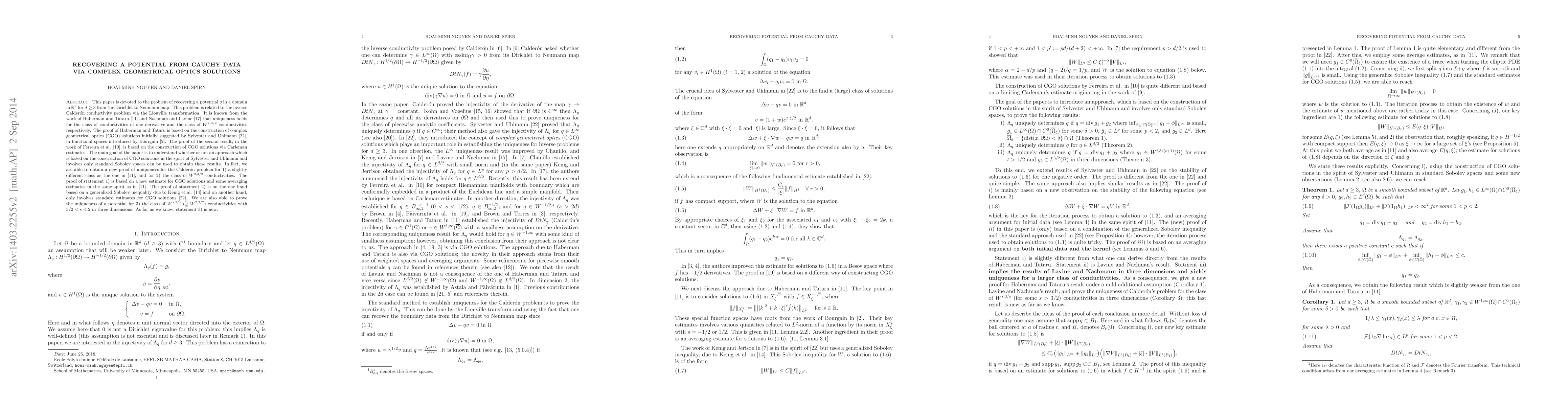This paper explores the recovery of a potential $q$ from the Dirichlet to Neumann map, addressing the inverse Calderón problem. It provides new proofs of uniqueness for various classes of conductivities using complex geometrical optics solutions, including a novel result for $W^{s, 3/s}$ conductivities in three dimensions.