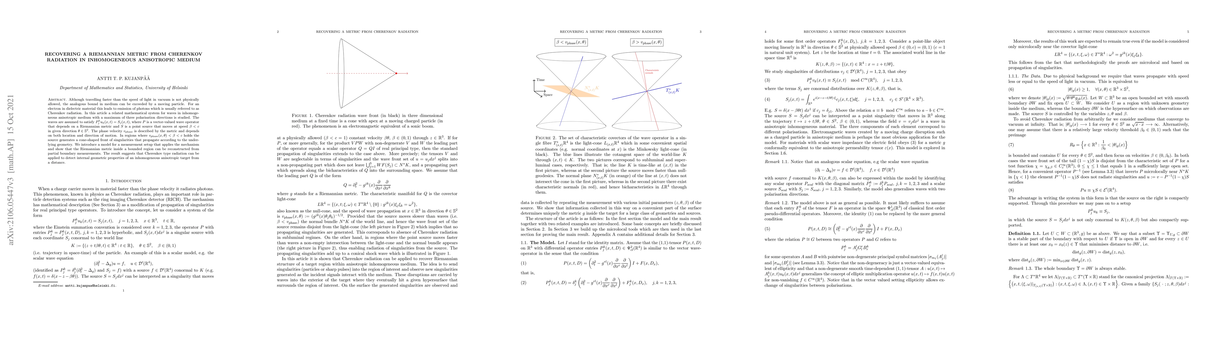 This paper explores the mathematical framework for waves in inhomogeneous anisotropic media, focusing on Cherenkov radiation. It demonstrates how a Riemannian metric can be reconstructed from partial boundary measurements of Cherenkov radiation, suggesting a method to detect internal geometric properties of anisotropic targets remotely.