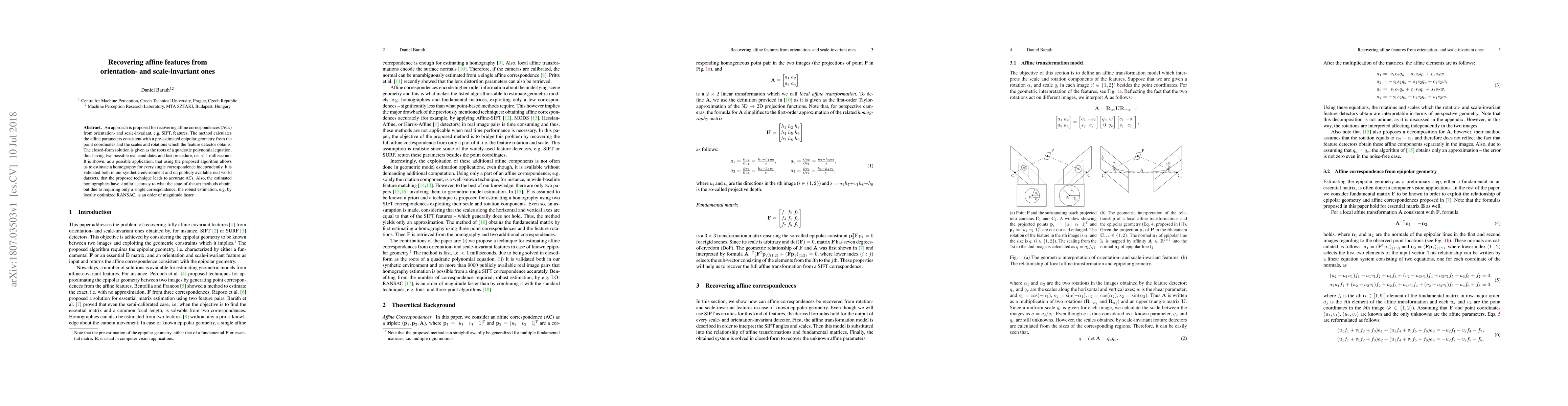 An approach is proposed for recovering affine correspondences (ACs) from orientation- and scale-invariant, e.g. SIFT, features. The method calculates the affine parameters consistent with a pre-estimated epipolar geometry from the point coordinates and the scales and rotations which the feature detector obtains. The closed-form solution is given as the roots of a quadratic polynomial equation, thus having two possible real candidates and fast procedure, i.e. <1 millisecond. It is shown, as a possible application, that using the proposed algorithm allows us to estimate a homography for every single correspondence independently. It is validated both in our synthetic environment and on publicly available real world datasets, that the proposed technique leads to accurate ACs. Also, the estimated homographies have similar accuracy to what the state-of-the-art methods obtain, but due to requiring only a single correspondence, the robust estimation, e.g. by locally optimized RANSAC, is an order of magnitude faster.