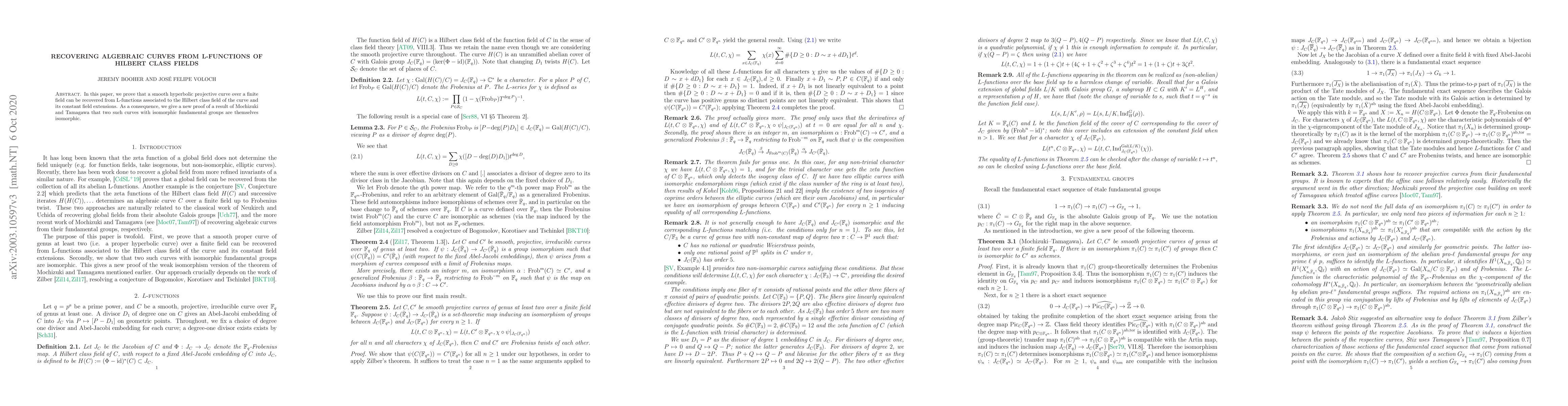 In this paper, we prove that a smooth hyperbolic projective curve over a finite field can be recovered from L-functions associated to the Hilbert class field of the curve and its constant field extensions. As a consequence, we give a new proof of a result of Mochizuki and Tamagawa that two such curves with isomorphic fundamental groups are themselves isomorphic.