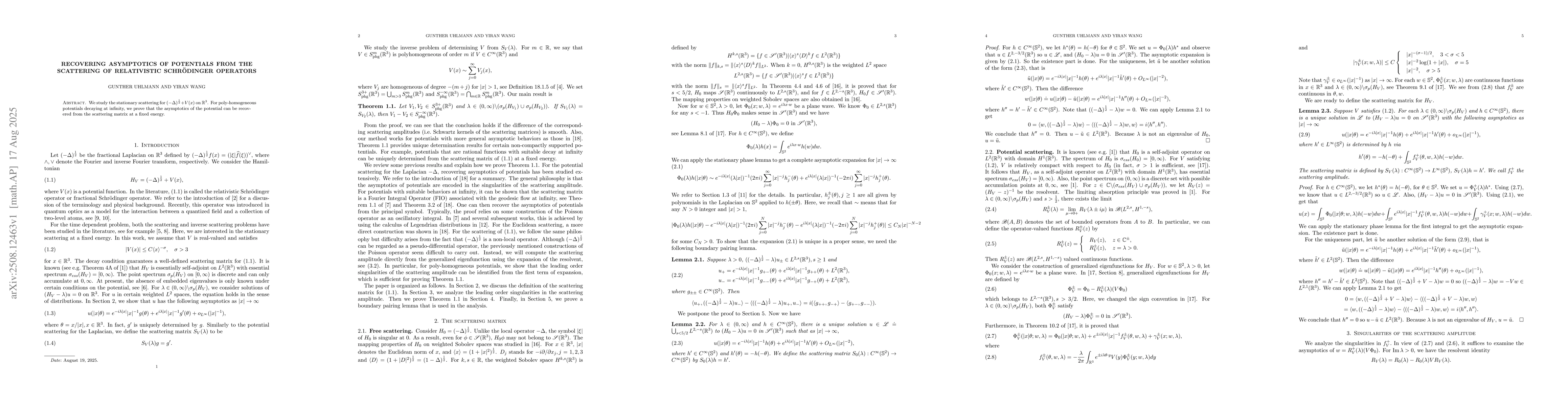 We study the stationary scattering for $(-\Delta)^{\frac 12} + V(x)$ on $\mathbb{R}^3$. For poly-homogeneous potentials decaying at infinity, we prove that the asymptotics of the potential can be recovered from the scattering matrix at a fixed energy.