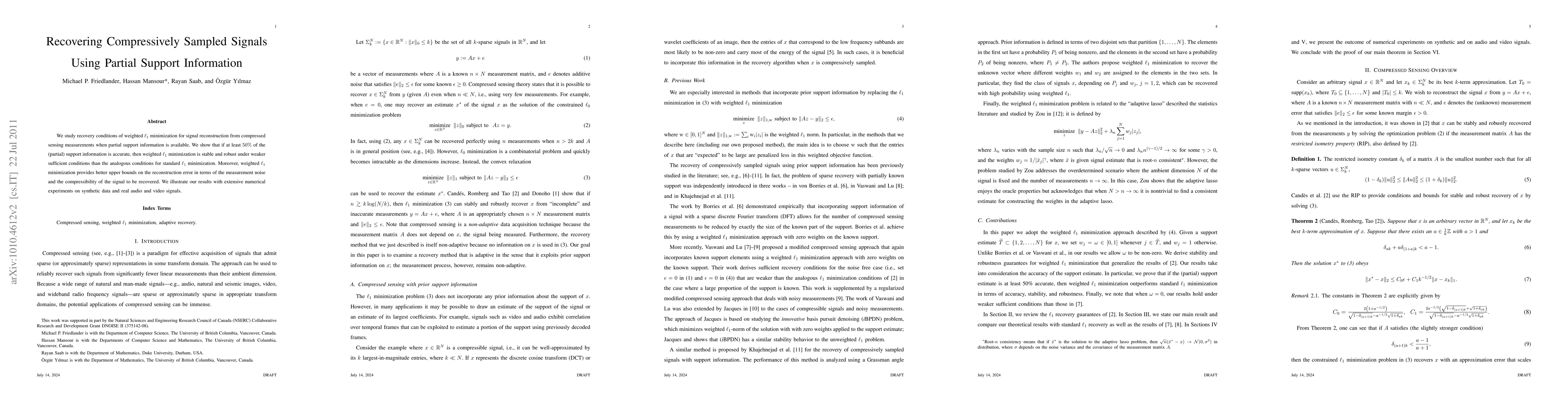 This paper investigates the recovery of signals from compressed sensing measurements using weighted $\ell_1$ minimization, demonstrating stability and robustness under weaker conditions when at least 50% of partial support information is accurate. It also shows that weighted $\ell_1$ minimization provides better error bounds compared to standard $\ell_1$ minimization, supported by numerical experiments on synthetic and real audio/video data.