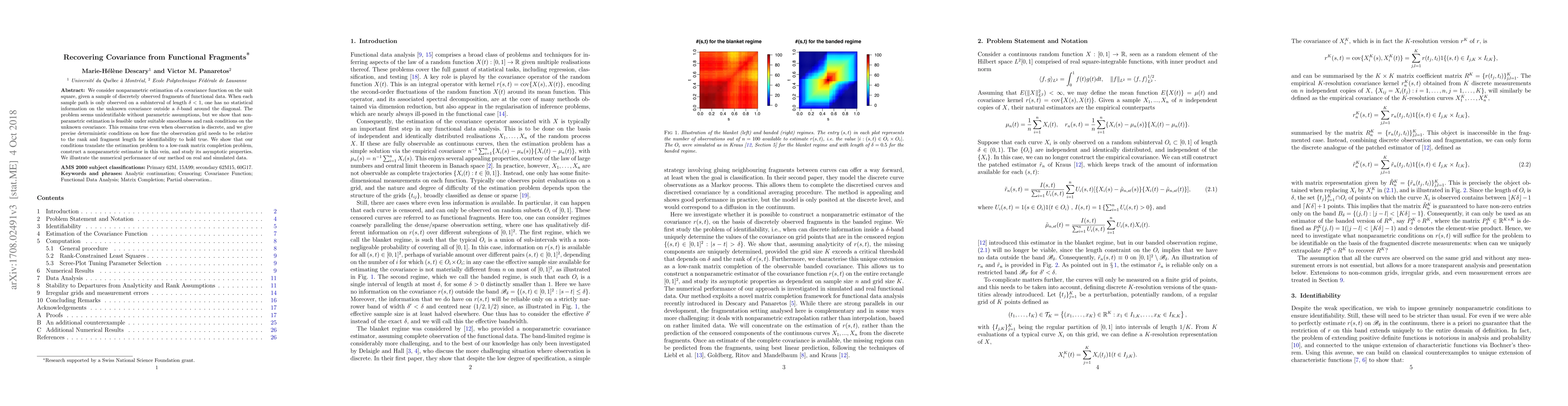 We consider nonparametric estimation of a covariance function on the unit square, given a sample of discretely observed fragments of functional data. When each sample path is only observed on a subinterval of length $\delta<1$, one has no statistical information on the unknown covariance outside a $\delta$-band around the diagonal. The problem seems unidentifiable without parametric assumptions, but we show that nonparametric estimation is feasible under suitable smoothness and rank conditions on the unknown covariance. This remains true even when observation is discrete, and we give precise deterministic conditions on how fine the observation grid needs to be relative to the rank and fragment length for identifiability to hold true. We show that our conditions translate the estimation problem to a low-rank matrix completion problem, construct a nonparametric estimator in this vein, and study its asymptotic properties. We illustrate the numerical performance of our method on real and simulated data.