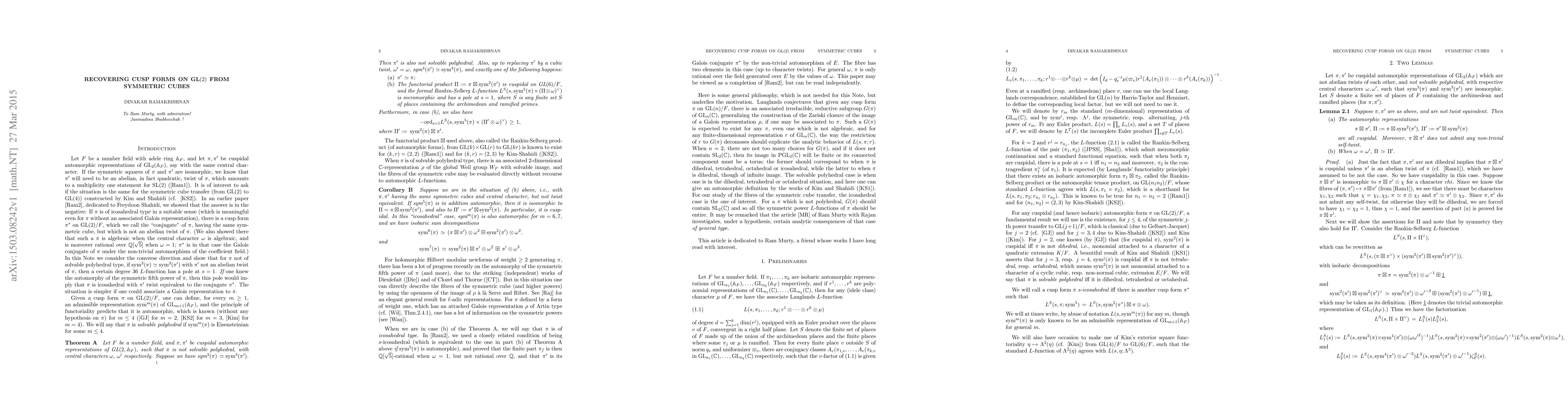 Summary: The paper establishes that if two cusp forms on GL(2) share the same symmetric cubes, they are either twist equivalent or share a specific $L$-function with a pole at $s=1$. Additionally, if the fifth power of one form is automorphic, it implies a connection to icosahedral symmetry.