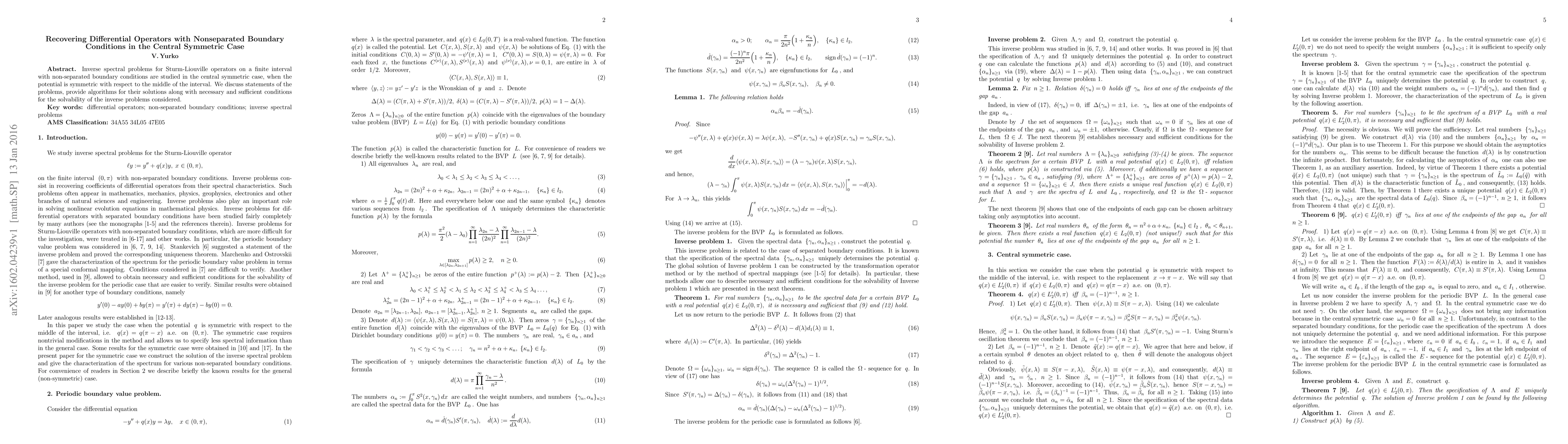 Inverse spectral problems for Sturm-Liouville operators on a finite interval with non-separated boundary conditions are studied in the central symmetric case, when the potential is symmetric with respect to the middle of the interval. We discuss statements of the problems, provide algorithms for their solutions along with necessary and sufficient conditions for the solvability of the inverse problems considered.