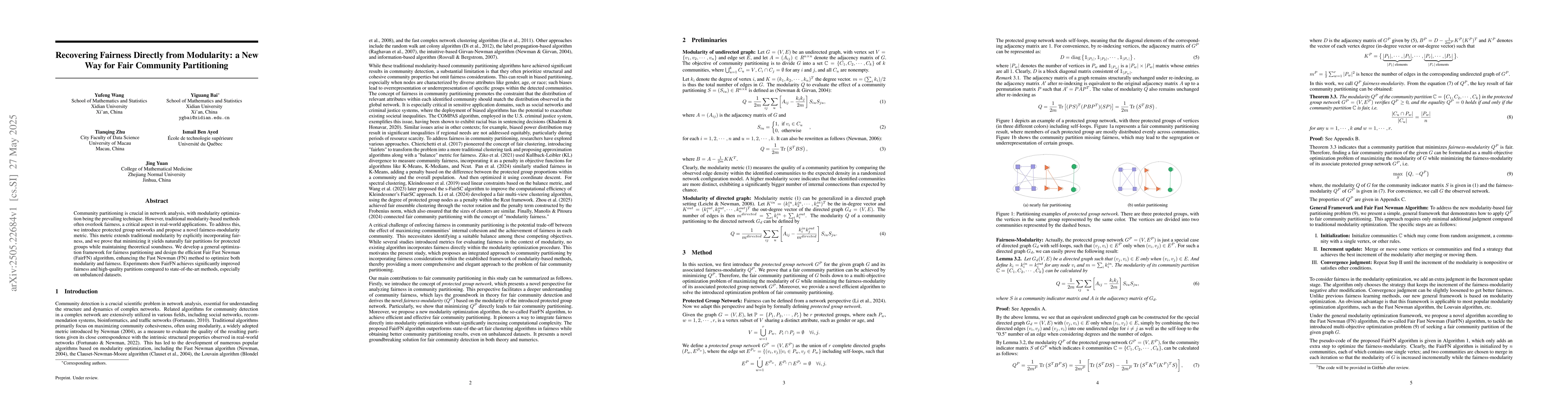 The research introduces protected group networks and a novel fairness-modularity metric, extending traditional modularity to explicitly incorporate fairness. It develops a general optimization framework for fairness partitioning and designs the Fair Fast Newman (FairFN) algorithm, enhancing the Fast Newman (FN) method.