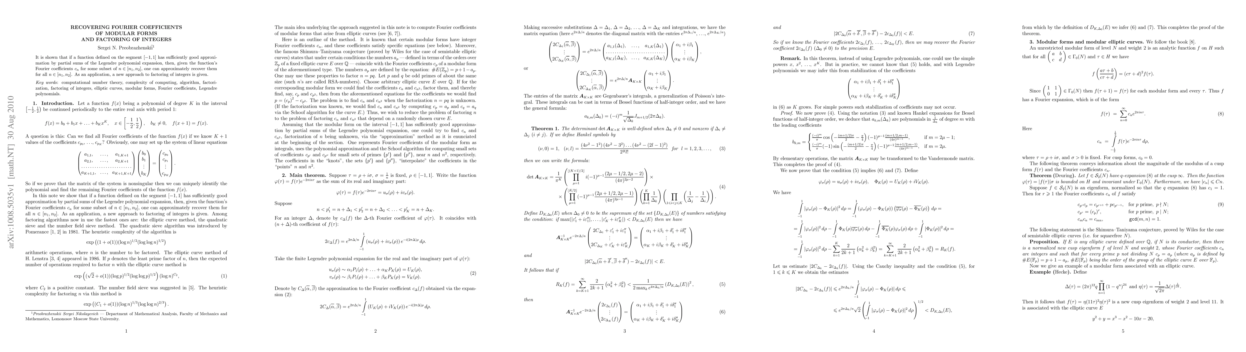 It is shown that if a function defined on the segment [-1,1] has sufficiently good approximation by partial sums of the Legendre polynomial expansion, then, given the function's Fourier coefficients $c_n$ for some subset of $n\in[n_1,n_2]$, one may approximately recover them for all $n\in[n_1,n_2]$. As an application, a new approach to factoring of integers is given.