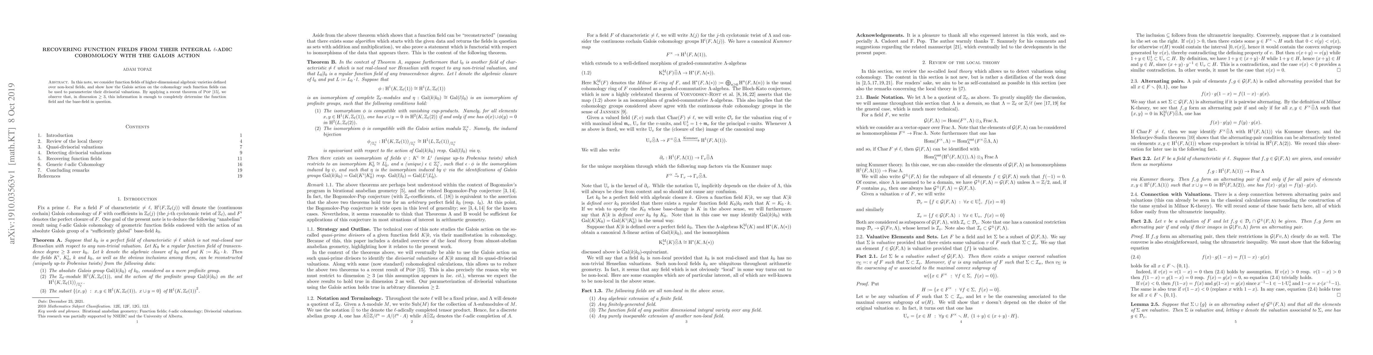 In this note, we consider function fields of higher-dimensional algebraic varieties defined over non-local fields, and show how the Galois action on the cohomology such function fields can be used to parameterize their divisorial valuations. By applying a recent theorem of Pop, we observe that, in dimension $\geq 3$, this information is enough to completely determine the function field and the base-field in question.