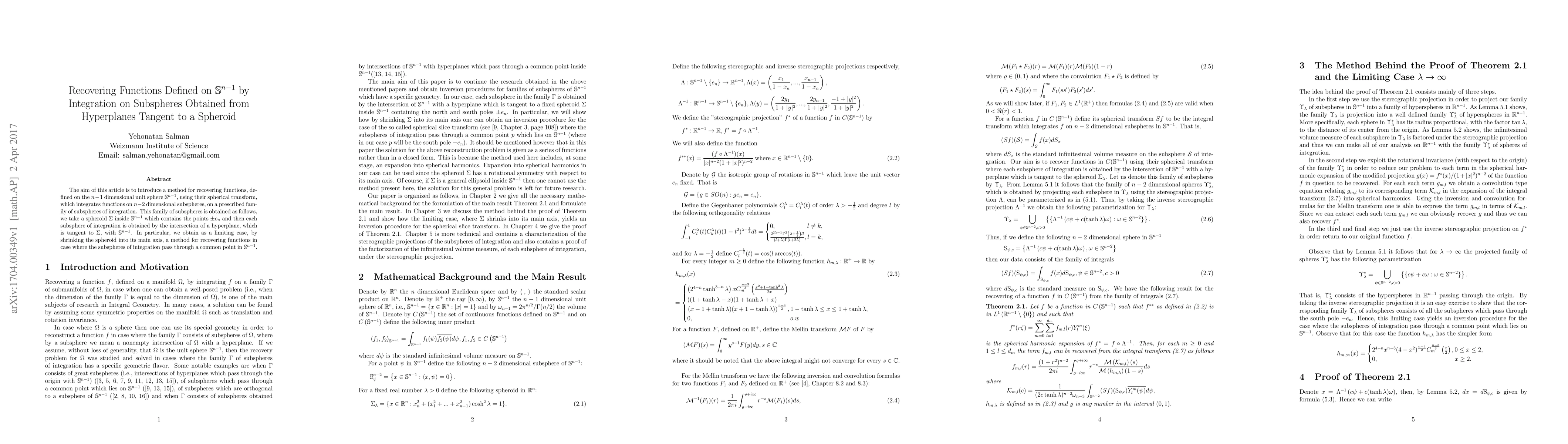 A method for recovering functions defined on the n-1 dimensional unit sphere using integration on subspheres is introduced, utilizing a family of subspheres obtained from hyperplanes tangent to a spheroid.